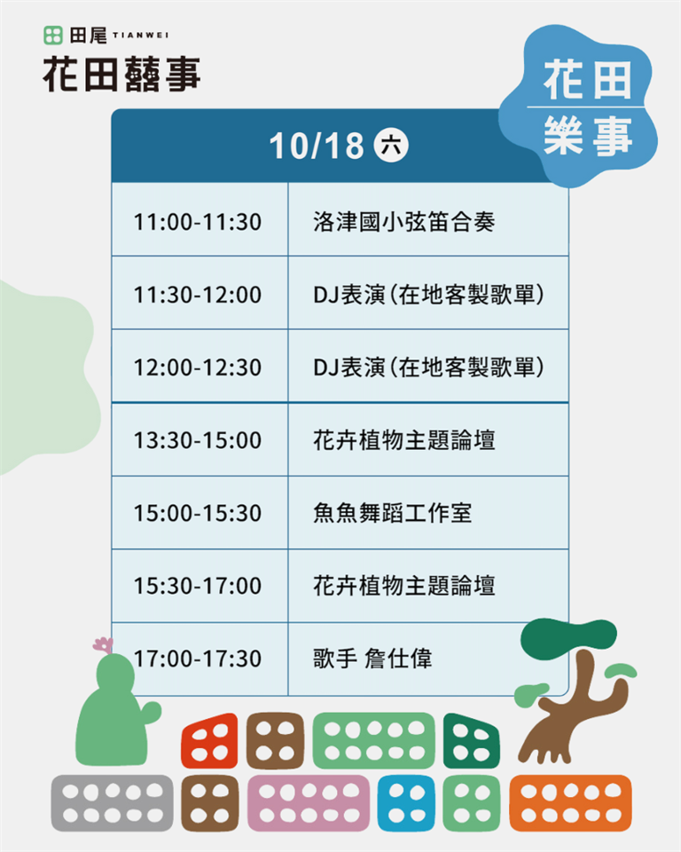 最新公告 【轉知】彰化縣地方稅務局「2025台灣設計展─花田囍事 花田衣秀」活動訊息 發布日期: 2025/10/15~2025/10/26 | 瀏覽人數: 7人 一、2025台灣設計展於114年10月10日至10月26日在彰化盛大登場,有關「花田衣秀」活動資訊如下:(一) 田尾時裝秀:114年10月24日(星期五)下午1時30分至3時30分,於隆盛樹化玉博物館舉行。(二) 花漾行:114年10月25日(星期六)下午1時30分至3時,於怡心園廣場與親子公園舉行。二、活動相關資訊及報名可進入本局官方網站/訊息專區/活動訊息或至彰化縣地方稅務局Facebook粉絲團查詢,亦可撥打0800-476969專線洽詢。