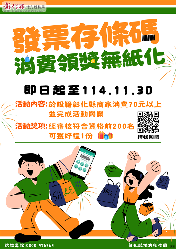最新公告 【轉知】彰化縣地方稅務局舉辦「發票存條碼 消費領獎無紙化」活動訊息 發布日期: 2025/10/20~2025/11/30 | 瀏覽人數: 17人 旨揭活動自即日起至114年11月30日止,於設籍彰化縣內之營業人商家消費70元以上,並完成活動表單任務,經本局審核符合資格前200名,即可獲好禮1份。相關活動詳情請參閱活動網站(https://reurl.cc/Nxmvjn)