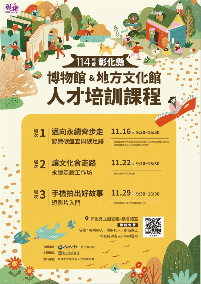 最新公告 彰化縣文化局辦理114年度彰化縣博物館與地方文化館人才培訓課程 發布日期: 2025/11/04~2025/12/04 | 瀏覽人數: 19人 旨揭課程資訊如附件資料,採線上報名,報名連結:https://forms.gle/5vkFrKNVGq15MJys9。