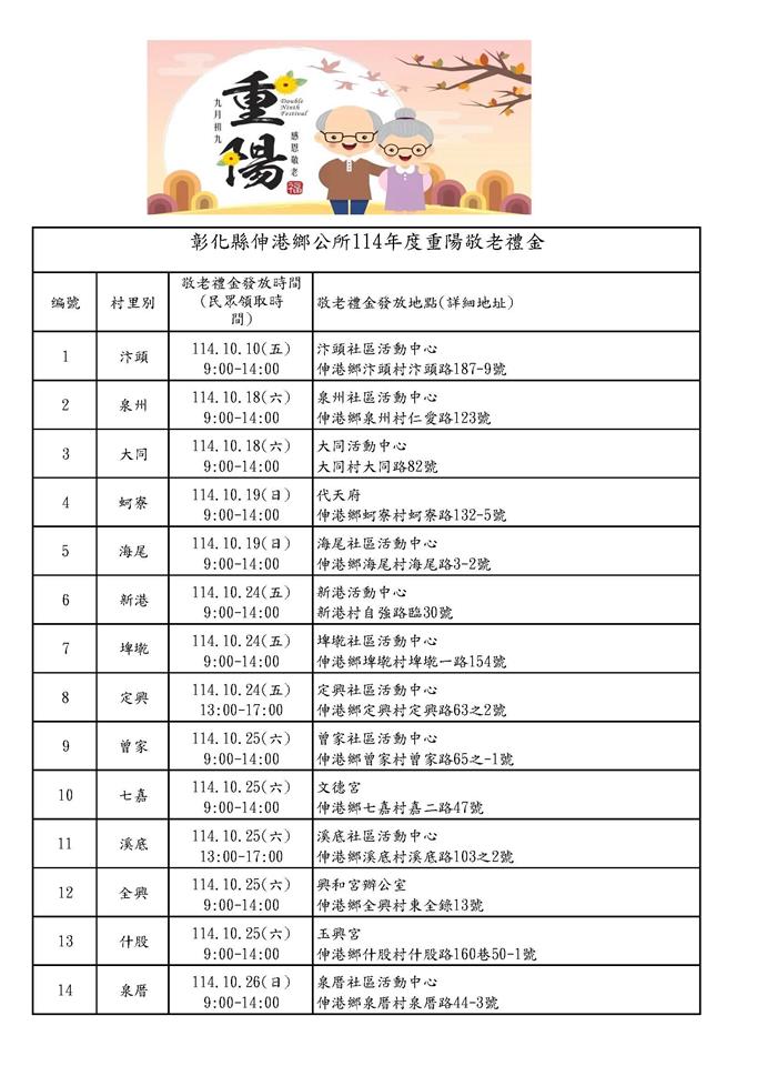 其他資訊 114年重陽禮金發放日程表。 發布日期: 2025/09/30~2025/10/26 | 瀏覽人數: 61人 | 聯絡資訊: 張先生 04-7982010分機152 114年重陽禮金發放日程表。
