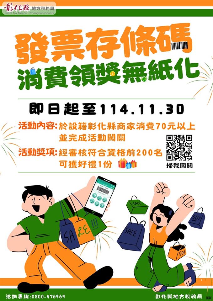其他資訊 彰化縣地方稅務局舉辦「發票存條碼 消費領獎無紙化」活動,請踴躍參加。 發布日期: 2025/10/21~2025/11/30 | 瀏覽人數: 34人 | 聯絡資訊: 陳小姐 04-7982010分機121 一、活動自即日起至114年11月30日止,於設籍彰化縣內之營業人商家消費70元以上,並完成活動表單任務,經本局審核符合資格前200名,即可獲好禮1份。 二、相關活動詳情請參閱活動網站(https://reurl.cc/Nxmvjn)、本局官網活動訊息或粉絲團查詢,或撥本局免費服務電話0800-476969洽詢。