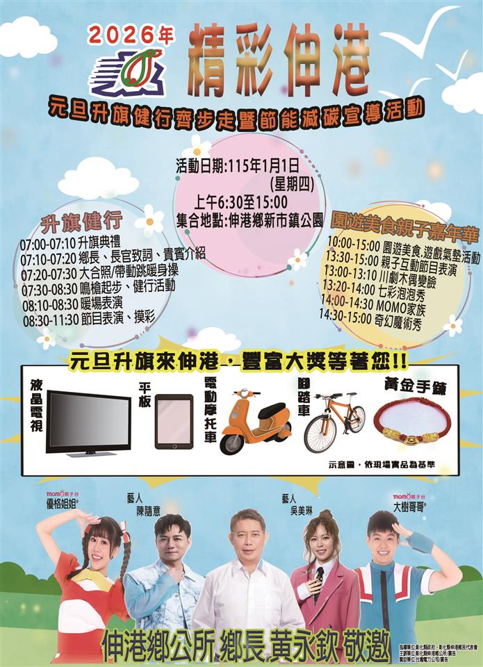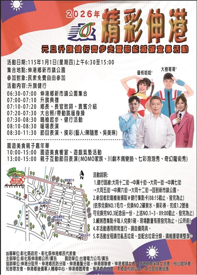 其他資訊 2026年精彩伸港元旦升旗健行齊步走。 發布日期: 2025/12/11~2026/01/01 | 瀏覽人數: 86人 | 聯絡資訊: 柯小姐 04-7982010分機152 2026年精彩伸港元旦升旗健行齊步走暨節能減碳宣導活動,訂於115年1月1日上午6:30起,於新市鎮公園辦理,歡迎民眾踴躍參加(免報名)。