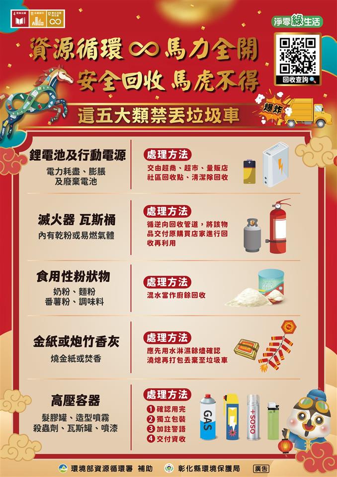 其他資訊 馬年大掃除動起來! 發布日期: 2026/02/09~2026/02/28 | 瀏覽人數: 55人 | 聯絡資訊: 林小姐 04-7980027分機14 馬年大掃除動起來! 以下這些物品回收時要特別注意喔 高壓容器、鋰電池及行動電源、滅火器及瓦斯桶、金紙及炮竹香灰、食用性粉狀物 為了清潔人員的作業安全,請大家務必正確分類,一起安心過好年!