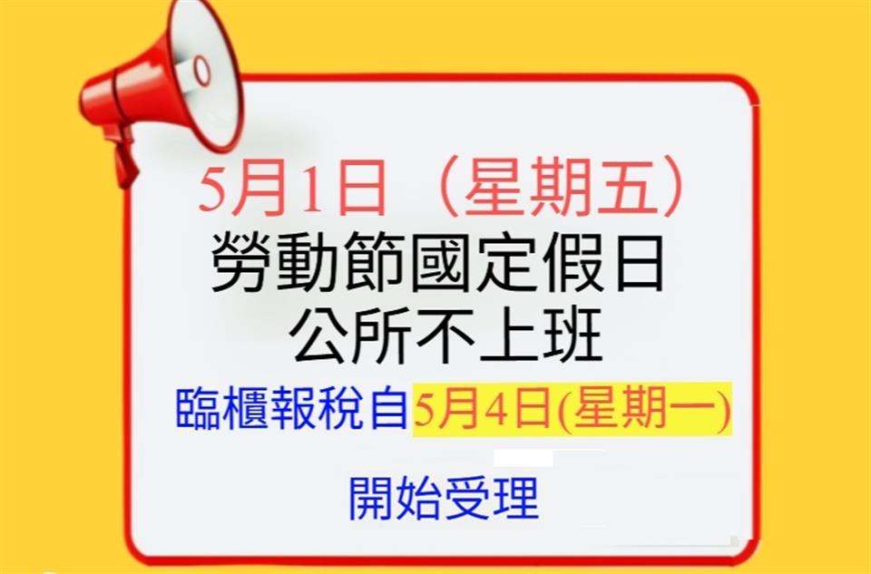 其他資訊 【重要公告】115年5月1日(星期五)為勞動節連續假期,綜合所得稅申報服務調整說明。 發布日期: 2026/04/28~2026/05/08 | 瀏覽人數: 17人 | 聯絡資訊: 陳小姐 04-7982010分機121 一、臨櫃服務:報稅服務將於 5月4日(星期一)上班日 受理。 二、網路/手機報稅不受影響:連假期間(5月1日至5月3日),民眾仍可利用「網路報稅(含手機報稅)」辦理申報。 三、臨櫃服務期限:自 5月4日起至 6月1日 止(原定 5月31日適逢假日,順延至6月1日截止)。 四、臨櫃服務時間:上午8點至下午5點(中午不休息)。 ※最後一天 6月1日(星期一)公所延長收件至晚上7點。 造成不便,敬請見諒,並請多加利用線上申報服務。