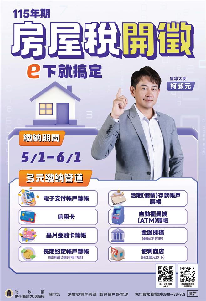 其他資訊 115年房屋稅於5月開徵。 發布日期: 2026/04/28~2026/06/01 | 瀏覽人數: 12人 | 聯絡資訊: 陳小姐 04-7982010分機121 115年房屋稅於5月開徵,繳納期間自5月1日 至6月1日,請如期繳納,彰化縣地方稅務局 關心您。