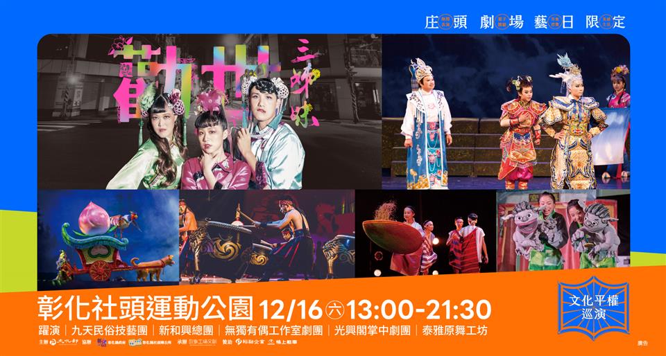 最新公告 文化部【文化平權巡演——庄頭劇場藝日限定】 歷史訊息 | 發布日期: 2023/11/28~2023/12/28 | 瀏覽人數: 77人 | 聯絡資訊: 圖書館 8730451 文化部【文化平權巡演—庄頭劇場藝日限定】,12月16日(六)來到社頭運動公園,從下午1點至晚上9點半,邀請大家來現場共享多元藝文活動,晚上7點免費觀賞售票場一票難求的「躍演」《勸世三姊妹》壓軸演出。活動節目如下:13:30-14:30:九天民俗技藝團《廟會狂響》14:30-15:30:新合興總團《哪吒鬧東海》15:30-16:30:無獨有偶工作劇團《赤腳門神》16:30-17:30:光興閣掌中劇團《國語按呢講,台語按怎講?》17:30-19:00:泰雅原舞工坊《豐收泰雅勤》19:00-21:30:躍演意猶未盡《勸世三姊妹》庄頭版★現場有文創商品市集、手作體驗工坊、DIY彩繪、胖卡餐車飲食、庄頭劇場紀念品好戲不斷,邀請各位鄉親一起來看戲喔!