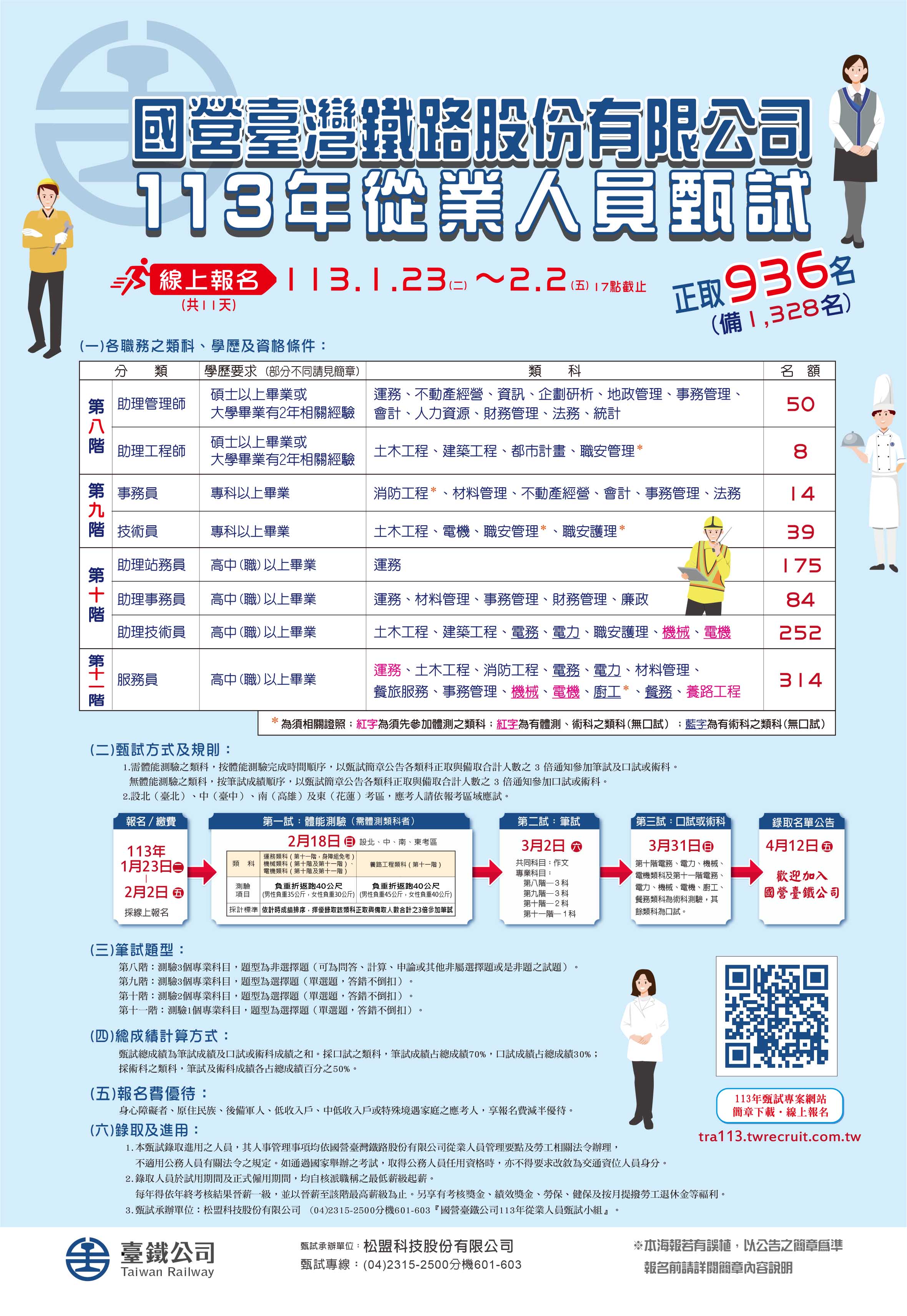 其他資訊 「國營臺灣鐵路股份有限公司113年從業人員甄試」簡章暨招考訊息 歷史訊息 | 發布日期: 2024/01/29~2024/02/29 | 瀏覽人數: 66人 | 聯絡資訊: 人事室 「國營臺灣鐵路股份有限公司113年從業人員甄試」簡章暨招考訊息