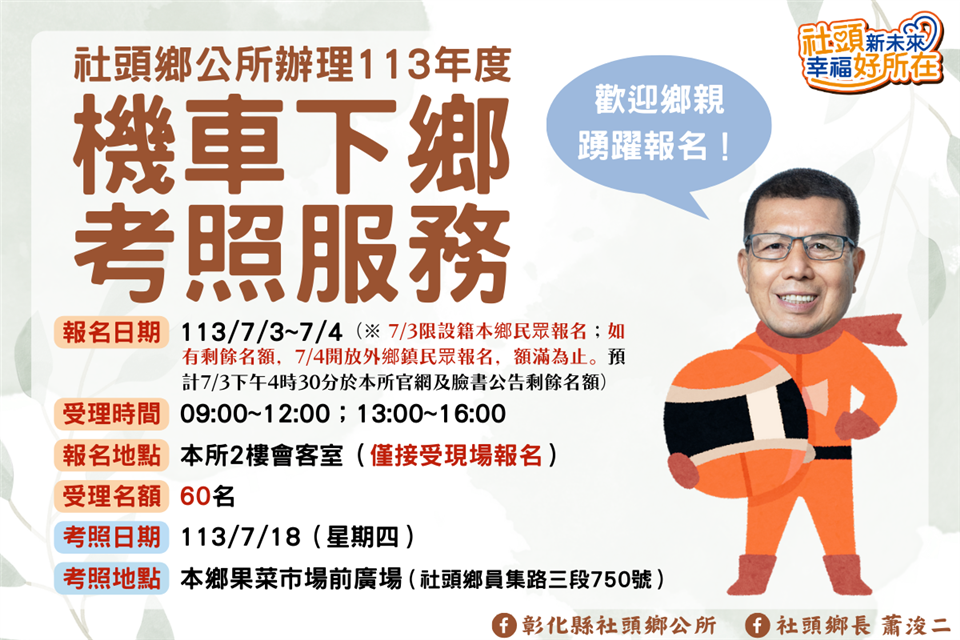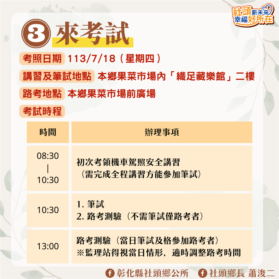 其他資訊 113年度社頭鄉機車下鄉考照服務 歷史訊息 | 發布日期: 2024/06/07~2024/07/05 | 瀏覽人數: 1443人 | 聯絡資訊: 楊先生 分機8732621#123 眾所期盼的113年度社頭鄉機車下鄉考照將在7月18日持續為鄉親們服務!為便利本鄉鄉親就近考取機車駕照,浚二鄉長特商請彰化監理站來到鄉內辦理113年度機車下鄉考照服務,相關資訊請參閱如下: 【報名資訊】: 1. 報名日期:7/3(星期三)至7/4(星期四)。 2. 受理時間:上午9時至12時;下午1時至4時。 3. 報名地點:本所2樓會客室(因需現場收件,恕不接受電話報名)。 4. 受理名額:60人。 ※ 7/3限設籍本鄉民眾報名;如有剩餘名額7/4開放外鄉鎮民眾報名,額滿為止。預計7/3下午4時30分於本所官網及臉書公告剩餘名額。 報考機車駕照應注意事項如下: 【體檢時應具備文件】:(請直接至社頭衛生所拿體檢表體檢) 1. 身分證或居留證正本。 2. 健保卡正本。 3. 一吋大頭照2張。 4. 體檢費用100元(衛生所價格)。 ※ 衛生所門診時段均可體檢,體檢時間如有異動恕不另行通知,請洽衛生所詢問。 ※ 持有汽車駕照或輕型機車駕照,體檢日起一年內可免再體檢,但須另填寫體檢表(機車駕駛執照登記書)粗框內之資料並檢附一吋大頭照2張。 【報名時應具備文件】: 1. 體檢合格之體檢表1份(即為機車駕駛執照登記書;體檢表即報名表)。 2. 身分證或居留證正反面影本(背後請書寫姓名並裁剪好)。 3. 一吋大頭照1張(考試通過製作駕照用,需與體檢表同一張照片,照片背後請書寫姓名)。 4. 如持有輕型機車駕照者,報名時請檢附駕照正反面影本(背後請書寫姓名並裁剪好)。 5. 報考費用:(請自備零錢) (1) 第一次報名: ① 需筆試及路考者250元。 ② 持有輕機駕照補路考者125元。 (2) 一年內第2次報名(筆試+路考)或僅路考者:125元。 ※ 自110年5月3日起持汽車駕照報名機車考照仍須參加筆試。 ※ 為保障鄉親報名機會,如有代為報名者,一人以領取2張號碼牌為限。 ※ 委託報名者,請檢視報名者資料均已備齊。 ※ 報考資格由彰化監理站審核,若未符合者本所將另行電話通知,請留下找得到人的電話,如因無法聯絡導致無法考照及領照,請自行負責。 ※ 洽詢電話:04-8732621#123 楊先生。 【考照資訊】: 1. 講習時間:7月18日(四)上午08:30至10:30。 2. 筆試時間:7月18日(四)上午10:30至12:00。 3. 路考時間:7月18日(四)上午10:30至12:00(不須筆試僅路考者);下午01:00至03:00(當日筆試及格者);監理站得視當日情形,適時調整路考時間。 4. 考試地點: (1) 筆試、講習於本鄉果菜市場內「織足藏樂館」二樓國際會議廳。 (2) 路考於本鄉果菜市場前廣場(社頭鄉橋頭村員集路3段750號)。 ※ 如報名後放棄考試,報考資料請於發照日領回,逾期未領本所將統一銷毀不負保管責任。 ※ 筆試題庫:可上交通部公路總局網站查詢https://www.thb.gov.tw →監理服務→筆試題庫→機車題庫。 【工商時間】: 為讓初考機車駕照者接受完整駕駛培訓課程,提升騎乘安全及強化防禦駕駛觀念,112年12月16日起至113年11月30日止,凡報名參加機車駕訓班並成功考取駕照者,公路總局即提供每人1,300元學費補助,詳情請洽彰化監理站(04)786-7161。