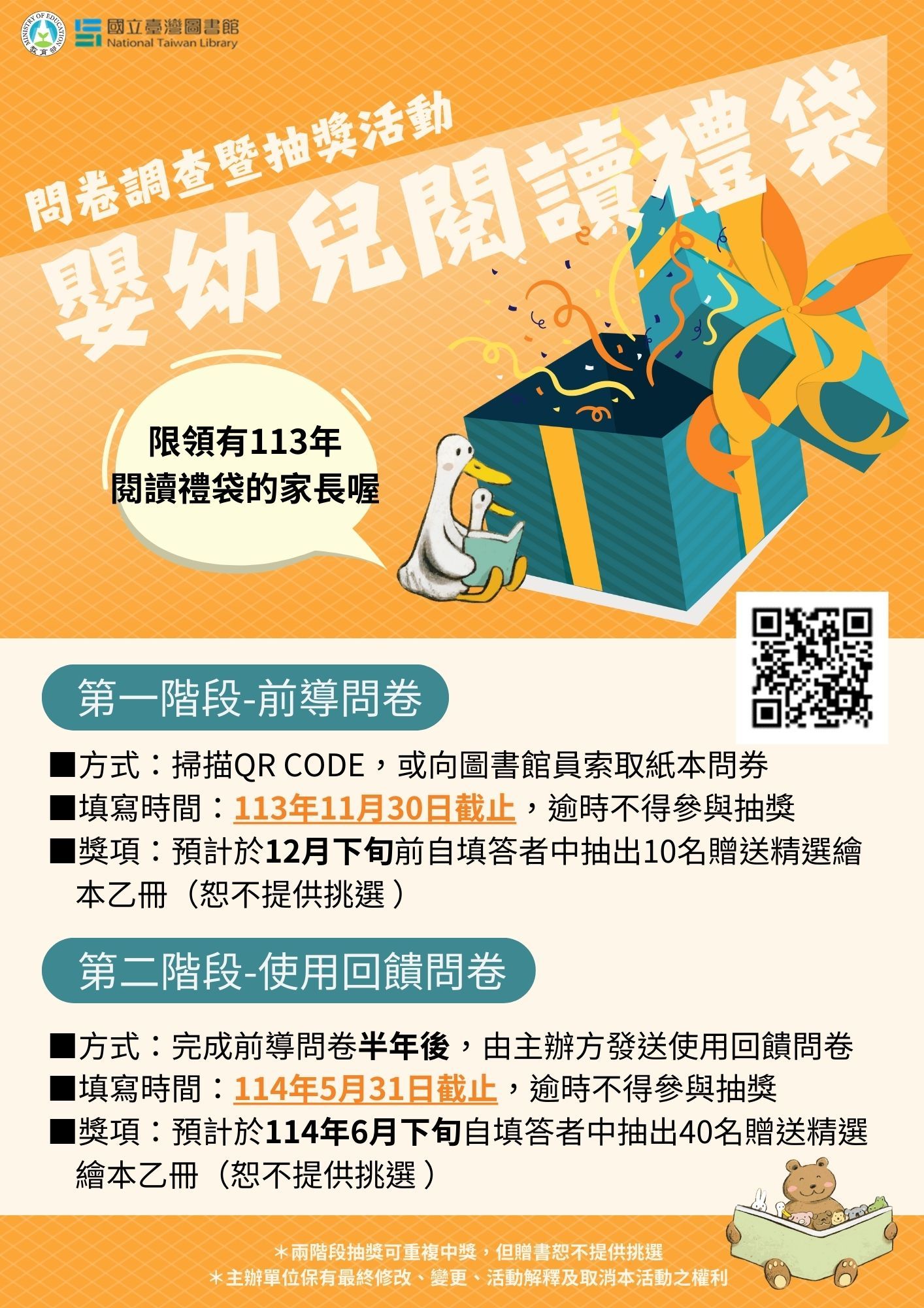 其他資訊 教育部113年「嬰幼兒閱讀禮袋利用情形」問卷調查暨抽獎活動 歷史訊息 | 發布日期: 2024/08/05~2024/11/30 | 瀏覽人數: 44人 | 聯絡資訊: 圖書館 04-8730451分機無 一、主辦單位:教育部 二、主旨:為瞭解家長得知教育部閱讀禮袋資訊之管道、利用閱讀禮袋、圖書館嬰幼兒閱讀資源情形,以及親子共讀的情況等,以家中領有113年閱讀禮袋之家為對象,進行調查。 三、可透過掃描附件之海報QR Code,進行填寫問卷;活動自即日起至113年11月30日止,詳細請參閱DM。