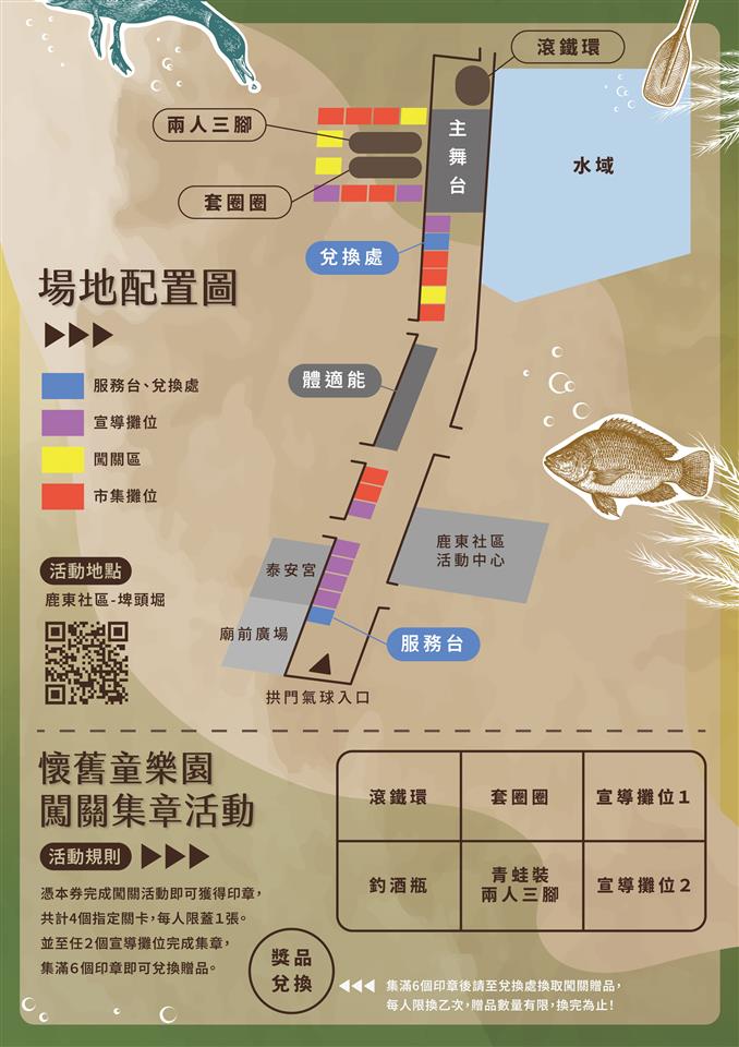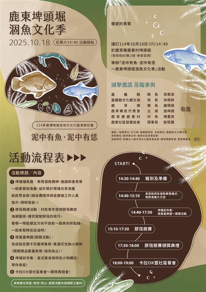 其他資訊 嘉義縣鹿草鄉公所114年度「博物館及地方文化館深耕計畫」-埤頭堀涸魚文化季「泥中有魚‧泥中有恁」 歷史訊息 | 發布日期: 2025/10/15~2025/10/18 | 瀏覽人數: 27人 | 聯絡資訊: 圖書館 04-8730451分機無 一、 旨揭活動預計於114年10月18日(星期六)14時30分至19時於鹿草鄉鹿東社區埤頭堀辦理,活動內容包含埤塘捕魚趣、膠筏競速活動、懷舊童樂園(闖關活動)及園遊會,並有晚間卡啦ok暨社區餐會。 二、 活動詳情請至FB搜尋【鹿草鄉立圖書館暨文化學堂】粉絲專頁,隨時掌握最新消息,如有異動依網站公告為準。