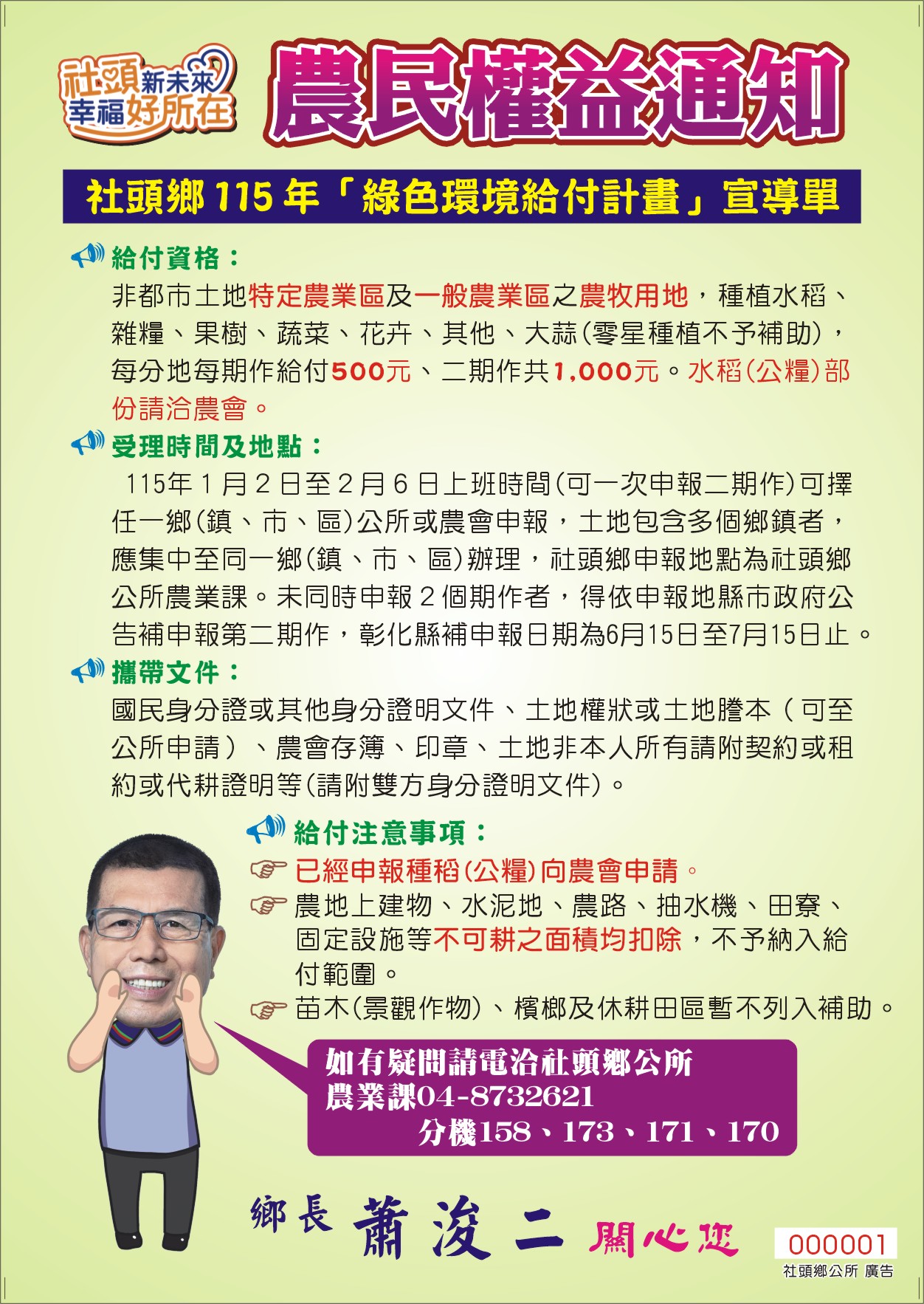 115年綠色環境給付計畫受理期間自即日起至2月6日止