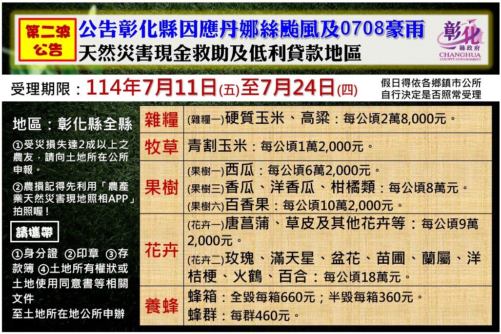 最新公告 第二波公告本縣為丹娜絲颱風及0708豪雨辦理現金救助及低利貸款地區】 歷史訊息 | 發布日期: 2025/07/11~2025/07/24 | 瀏覽人數: 79人 | 聯絡資訊: 鄭先生 8832171分機333 第二波公告本縣為丹娜絲颱風及0708豪雨辦理現金救助及低利貸款地區】 農民可申報日期為「114年7月11日至7月24日」,本所平常上班日受理時間為上午8時至下午17時(中午休息12時至13時),周末假日開放受理時間為上午8時至下午16時(中午不休息)。公告作物品項: 1.硬質玉米、高粱 2.青割玉米3.西瓜、香瓜、洋香瓜、柑橘類、百香果4.花卉(其中大小菊、非洲菊已於第一波公告救助,請於7月23日前申請)5.蜂箱、蜂群請符合規定可申請救助農民於申請期限內,儘速攜帶向土地所在地公所申報: 身分證、印章、農會存款簿、土地所有權狀或土地使用同意書及其他應備文件(如三個月內土地登記謄本)再次提醒,農民若發現災情,應立即拍照存證,並通報所在鄉鎮公所進行災損勘查,相關農損補助申請條件將依農業部公告為準。