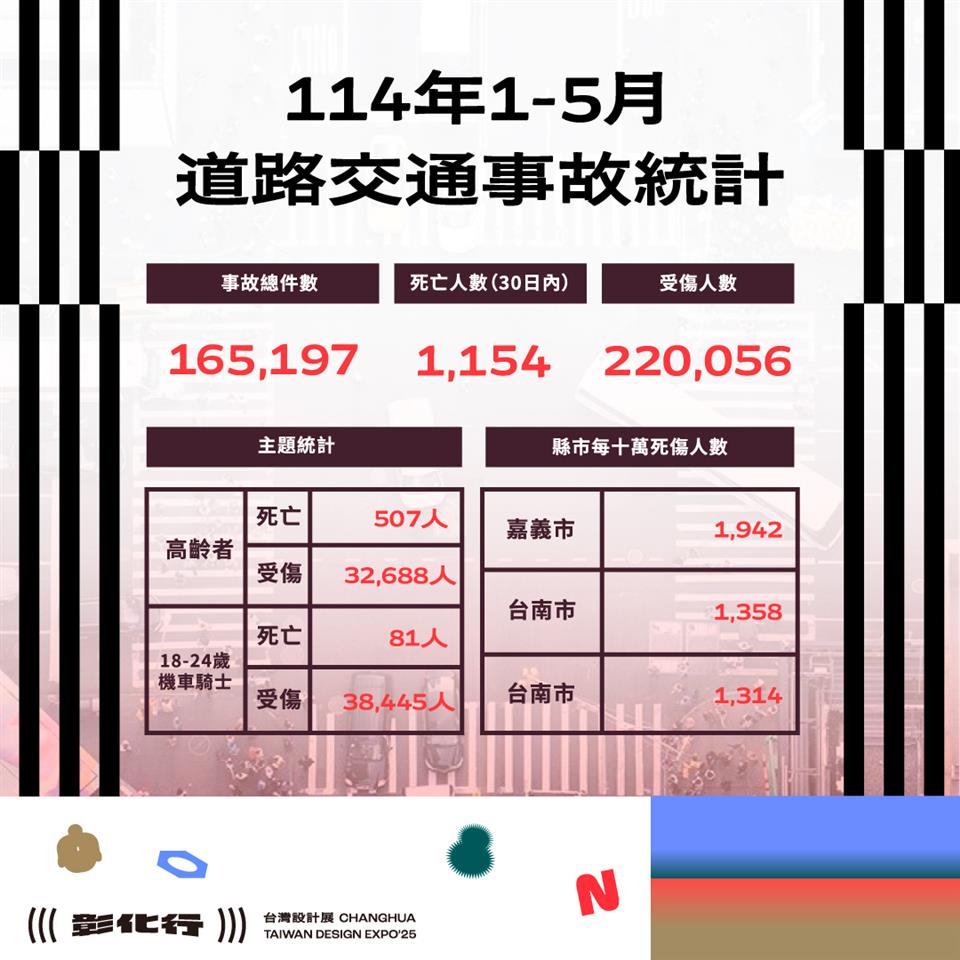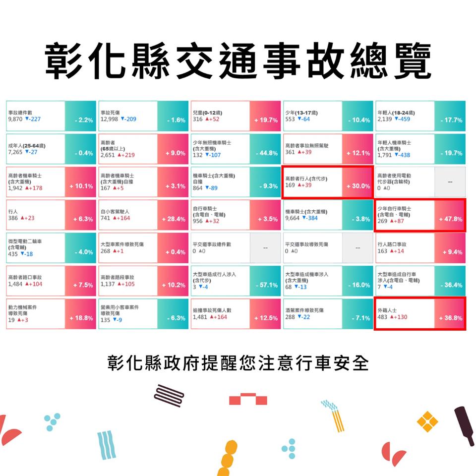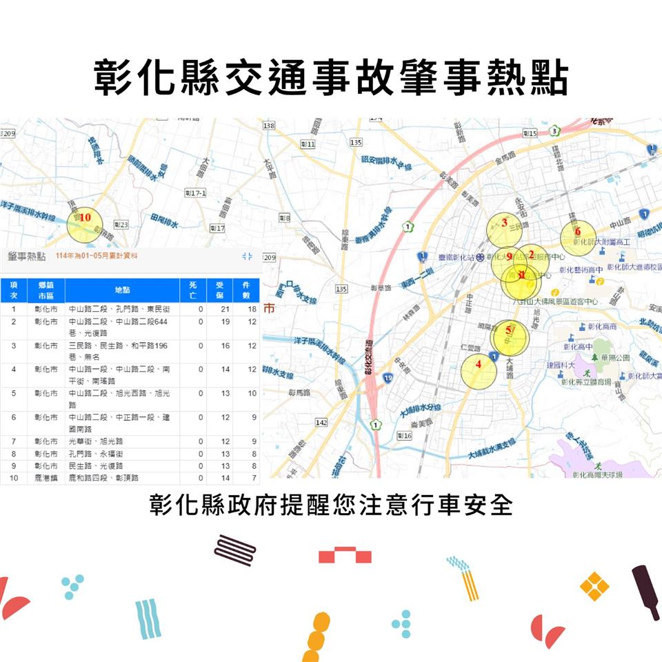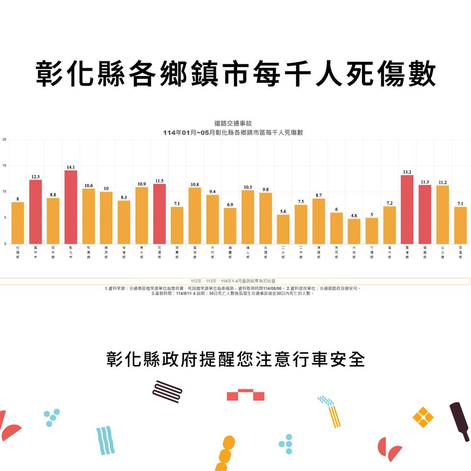 最新公告 彰化縣政府114年1-5月道路交通事故安全宣導 歷史訊息 | 發布日期: 2025/08/18~2025/09/18 | 瀏覽人數: 22人 | 聯絡資訊: 張家銘 8832171分機370 彰化縣政府114年1-5月道路交通事故安全宣導(一)114年1-5月道路交通事故死傷累計12,998人,行人請走行人穿越道,走對的路安全回家。(二)戴上安全帽,雙手握車把,專心騎車才是最酷的模樣!(三)Drunk driving can result in not only a fine but also being deported.根據交通部道安資訊查詢網統計快覽數據跟112年同期比較分析,以少年自行車騎士(含電自、電輔) 事故增加47.8%最高,外籍人士事故增加36.8%次之,高齡者行人(含代步車)增加30%再次之。1-5月份30日鄉鎮市每千人死傷人數於「彰化市、鹿港鎮、員林市」為多,肇事熱點以「彰化市」為多。彰化縣政府關心您。