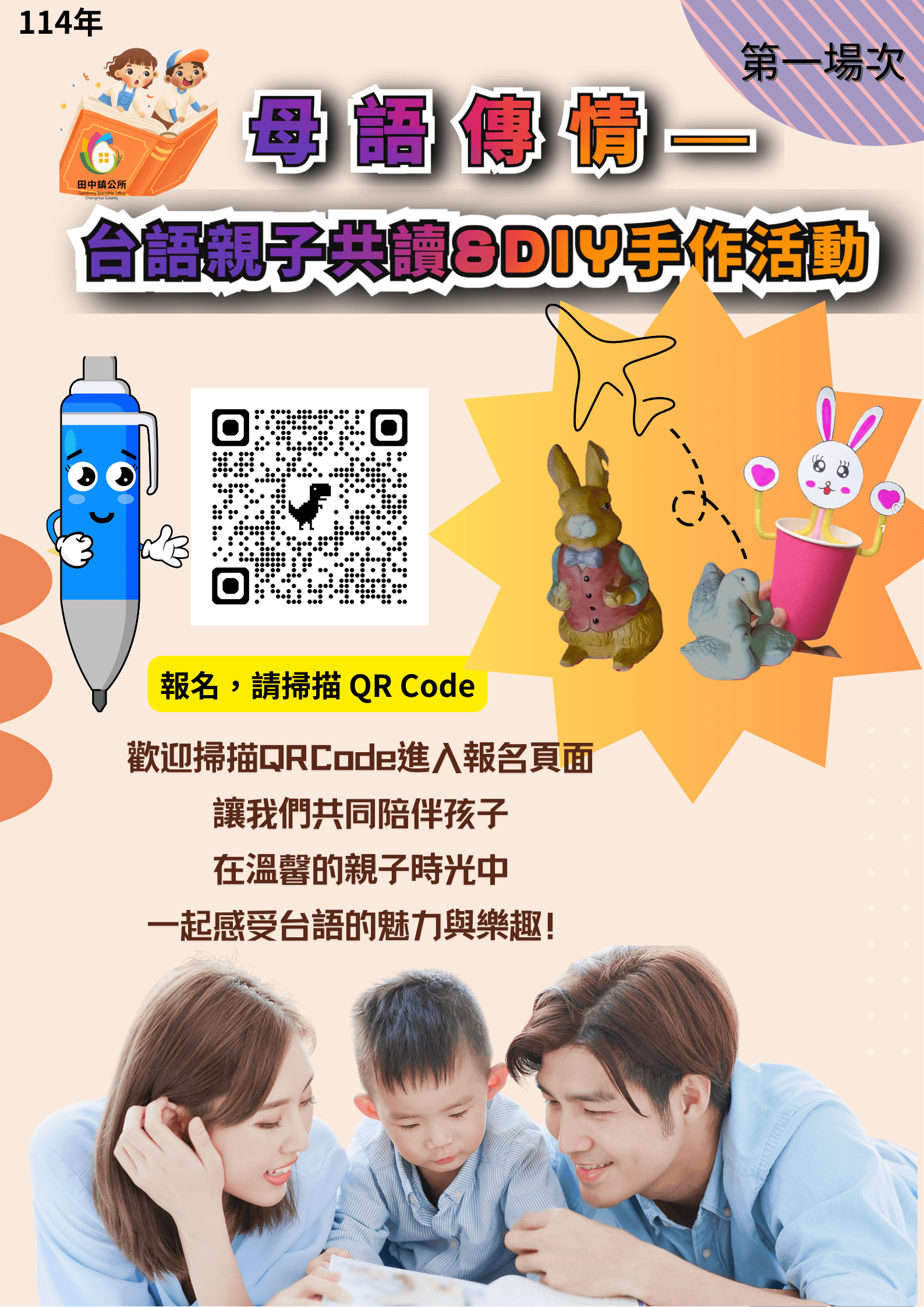 最新公告 田中鎮立圖書館🎉 #母語傳情—台語親子共讀 & DIY手作 🎉活動訊息 歷史訊息 | 發布日期: 2025/07/24~2025/08/24 | 瀏覽人數: 41人 | 聯絡資訊: 倪育璋 8742138分機11 🎉 #母語傳情—台語親子共讀 & DIY手作 🎉🌸 #首場8月2日活動開放報名啦! 🌸爸爸媽媽、阿公阿嬤們~暑假想帶孩子一起聽台語故事、做手作嗎?來圖書館就對了!在故事和手作DIY中感受 台語的溫度與文化魅力 💖📅 活動時間共三場次,每場內容皆精彩:📖第1️⃣場:8/2(六)09:00-12:00📖第2️⃣場:8/9(六)09:00-12:00📖第3️⃣場:8/14(四)09:00-12:00📍 活動地點:田中鎮立圖書館 2 樓會議室👩🏫 活動內容☑️台語繪本/童書共讀☑️搭配 趣味DIY手作☑️從閱讀到創作,體驗台語文化之美!🔸 報名方式1️⃣ 現場櫃台報名(田中鎮中新路229號) 🕘 每日上午9:00–12:00/下午1:00–5:002️⃣ 線上報名 → 掃 QR Code 填表完成 →至報名連結報名:https://reurl.cc/da2QdM