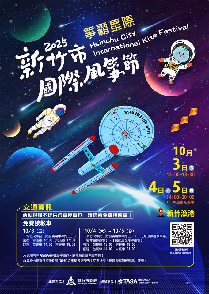 最新公告 新竹市政府辦理「2025新竹市國際風箏節」活動海報 歷史訊息 | 發布日期: 2025/09/17~2025/10/05 | 瀏覽人數: 68人 一、依據新竹市政府114年9月15日府產漁字第1140155491號函辦理。二、旨揭活動訂於114年10月3日(星期五)至10月5日(星期日)在新竹漁港舉辦,相關資訊可至活動官網(https://www.hc-kite.com/)查詢。