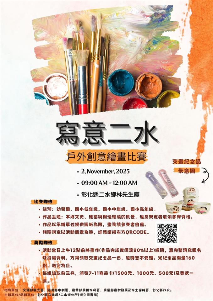 最新公告 轉知二水鎮公所辦理2025二水國際跑水節活動,「寫意二水」戶外創意繪畫比賽活動訊息 發布日期: 2025/10/15~2025/11/15 | 瀏覽人數: 36人 | 聯絡資訊: 倪育璋 8742138分機11 *二水鎮公所辦理2025二水國際跑水節活動,「寫意二水」戶外創意繪畫比賽活動一、比賽時間:114年11月2日(星期日)9時至12時,12時前完成交件者現場兌領交畫紀念品1份。(限量160份,換完為止)二、比賽地點:二水鄉林先生廟。三、參加對象:以西元(下同)2025年11月之學籍為準,分為幼兒園、國小低年級、國小中年級、國小高年級等4組比賽。四、報名方式:採現場報名,現場領取活動專用圖畫紙。五、畫具:畫具自備,繪畫材料不拘,以平面創作為限。六、活動簡章請至跑水節活動網站(https://ershuiwaterun.tw/)查詢。