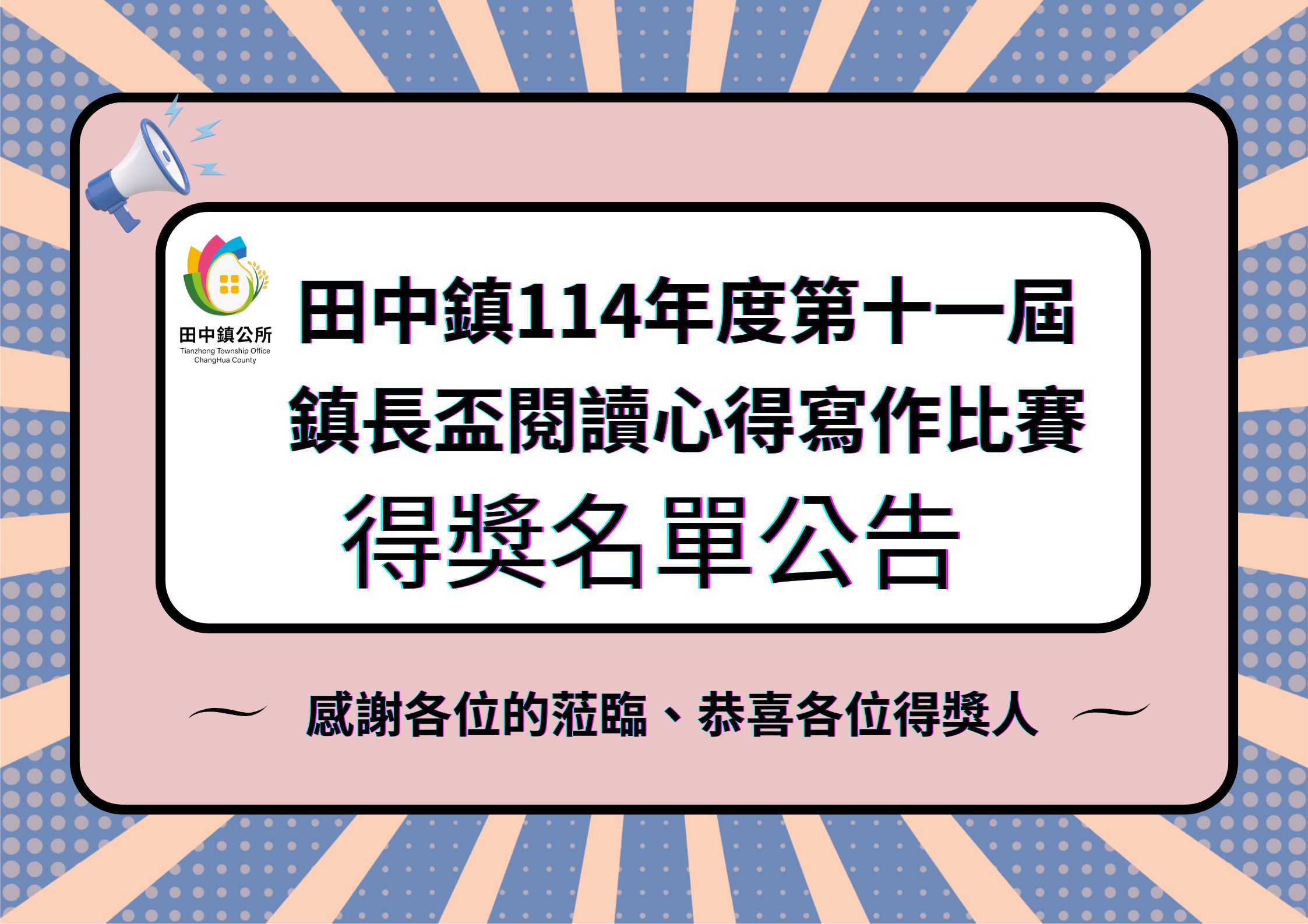 最新公告 公告彰化縣田中鎮公所114年度第11屆 【鎮長盃閱讀心得寫作比賽】得獎名單 發布日期: 2025/10/30~2025/11/30 | 瀏覽人數: 272人 | 聯絡資訊: 倪育璋 8742138分機11 114年度田中鎮第11屆【鎮長盃閱讀心得寫作比賽】得獎名單如附件檔◎佳作未排名次,是依學校名稱筆劃排序。◎頒獎典禮訂於114年11月12日(三)下午14時於田中高中繁星樓4樓視聽教室舉行 ◎恭喜各位得獎者獲得殊榮,本鎮圖書館將以函文通知得獎學生學校統一帶隊領獎、另個人部分將以電話通知得獎者領獎時間及地點。