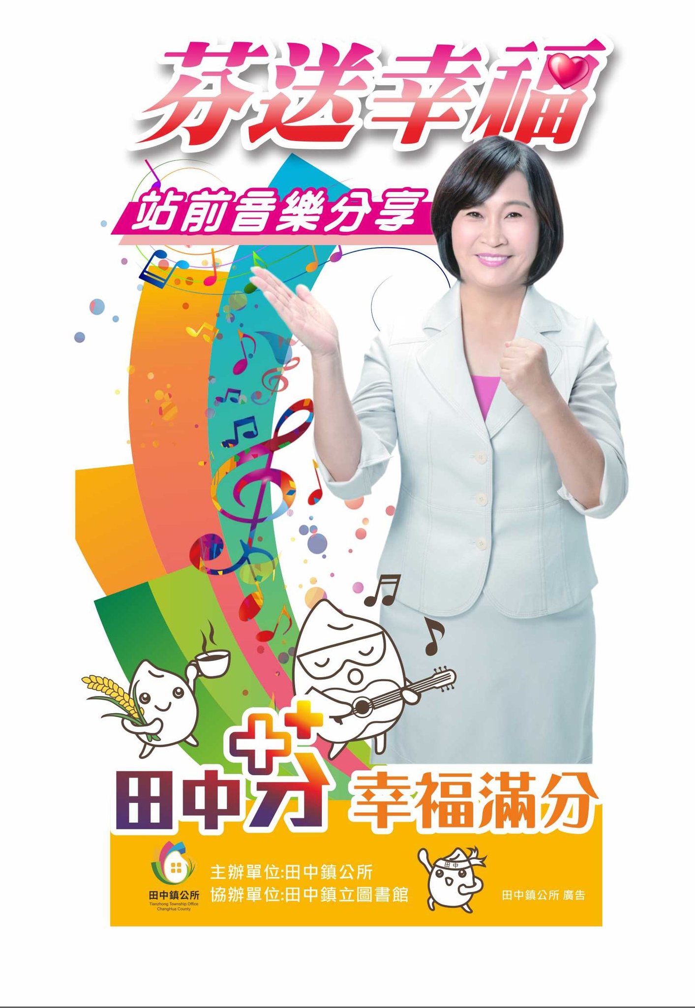 最新公告 本所115年度第2期「芬送幸福-站前音樂分享活動」表演報名開始了! 歡迎各界藝文公益表演團體踴躍報名參加。 發布日期: 2026/04/07~2026/05/07 | 瀏覽人數: 35人 | 聯絡資訊: 倪育璋 8742138分機11 😍活動期程:115年5月16日至115年8月29日。(5/16、5/23、5/30、□6/6、6/27、7/11、7/18、7/25、8/1、8/15、8/22、8/29) ❤️表演時段:每週六晚上7時至9時(本期1月至3月間預計採冬季時段晚間6點30分至8點30分,屆時將視氣候公告調整)。 🧡表演地點:田中火車站前廣場。 💜節目名稱或表演類型:歌唱、跳舞、樂器演奏。 💚申請時間:即日起至4月30日止,依田中鎮立圖書館粉絲專頁公告內容。 💙申請方式:填寫報名表並繳交至本鎮圖書館,由圖書館進行審查及安排活動檔期。🥰備註: 1.本活動表演為無償公益演出,表演團體需自行負責場地布置及復原、音響、茶點等事宜,本所提供現場燈光、電源、椅子及2箱瓶裝水供活動使用。 2.活動僅限表演藝術節目使用,並開放公眾觀賞,禁止營利行為。 3.當日活動若遇下雨或不便演出之不可抗力因素,將擇期辦理或取消。