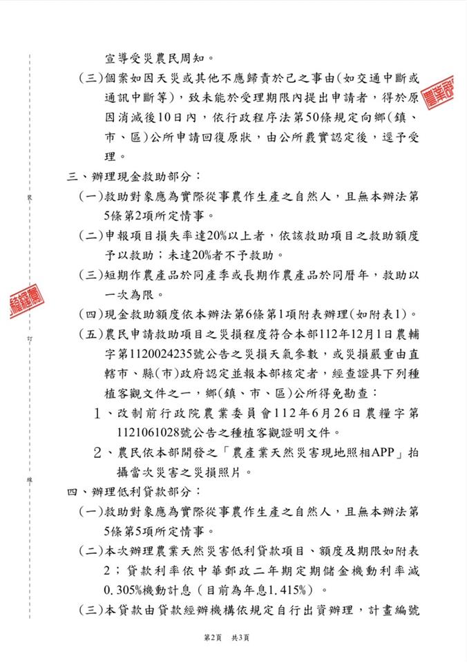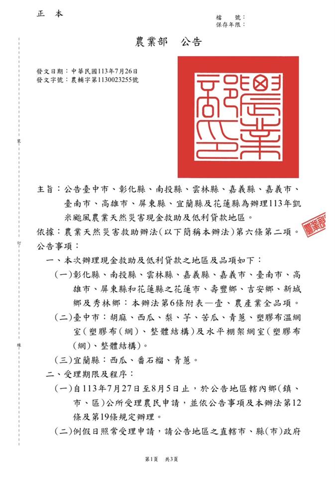 最新公告 113年凱米颱風農業天然災害農產業全品項現金救助受理至113年8月5日止 歷史訊息 | 發布日期: 2024/07/29~2024/08/05 | 瀏覽人數: 42人 農業部公告彰化縣為辦理農產業全品項113年凱米颱風農業天然災害現金救助地區,申請期間至113年8月5日止。請洽土地所在地公所農業課申請。(一)救助對象為實際從事農作生產之自然人,且無農業天然災害救助辦法第五條第二項所定情事。 (二)土地位於本鄉轄內者,應攜帶下述文件於申請期間至本所農業課辦理申請:1、身分證、印章、線西鄉農會存褶。 2、申請人為土地所有權人,應檢附土地所有權證明文件或轉(契)作申報書收執聯。3、申請人非土地所有權人,應檢附委託經營契約書或租賃契約書或土地使用同意書或轉(契)作申報書收執聯。
