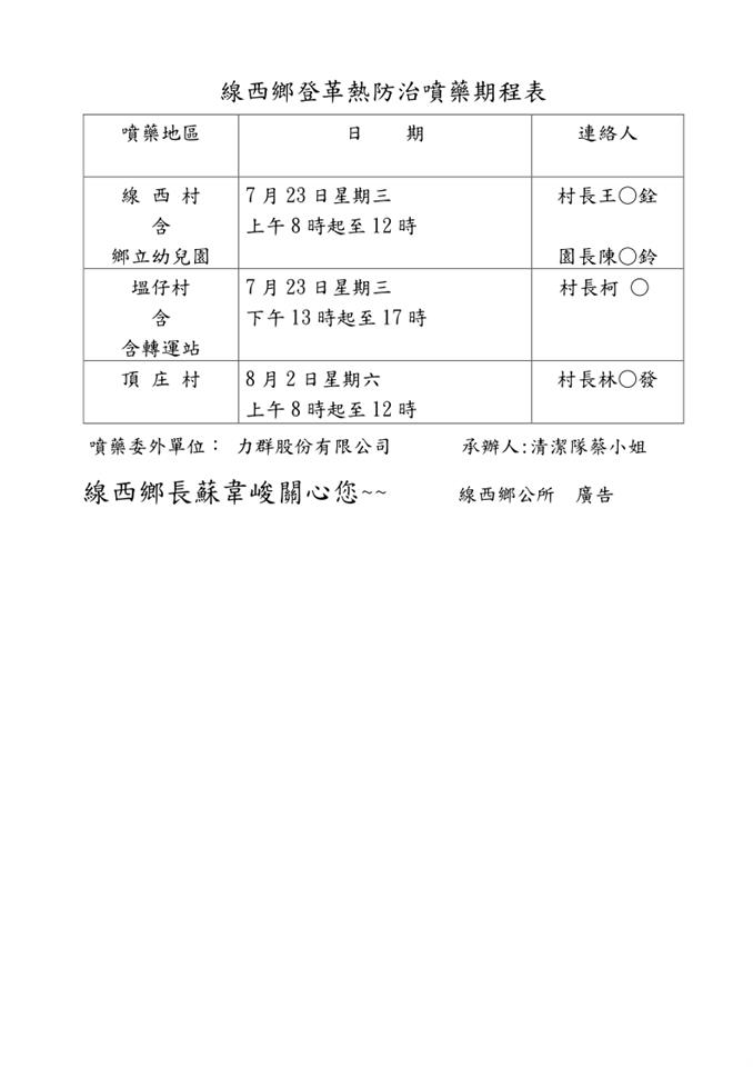 最新公告 彰化縣線西鄉114年登革熱防治全鄉噴藥,因颱風來襲,部分村里因雨延期通知。 歷史訊息 | 發布日期: 2025/07/17~2025/08/10 | 瀏覽人數: 65人 〈一〉受影響之線西村、塭仔村、頂庄村等3村,更新規劃期程如附件,屆時仍請鄉親依注意事項配合辦理。〈二〉注意事項如下:1. 確實將飼養的禽、畜圈圍周全並將室外水族箱妥善加蓋-2. 居家周遭積水容器務必倒置或清除,以防止病媒蚊孳生-3. 避免靠近噴藥人員50公尺內,如巧遇請迅速離開。藥劑正確使用下雖對人體刺激性低,但長時間接觸或吸入仍有風險。4 妥善看顧家中孩童及寵物,避免誤觸藥劑。5. 噴藥期程為預先規劃,實際施作日期依天候及村辦公處需求調整。6 民眾可自行下載參閱或洽詢清潔隊及各村辦公處瞭解詳情。〈三〉落實巡、倒、清、刷四步驟,杜絕病媒蚊孳生。