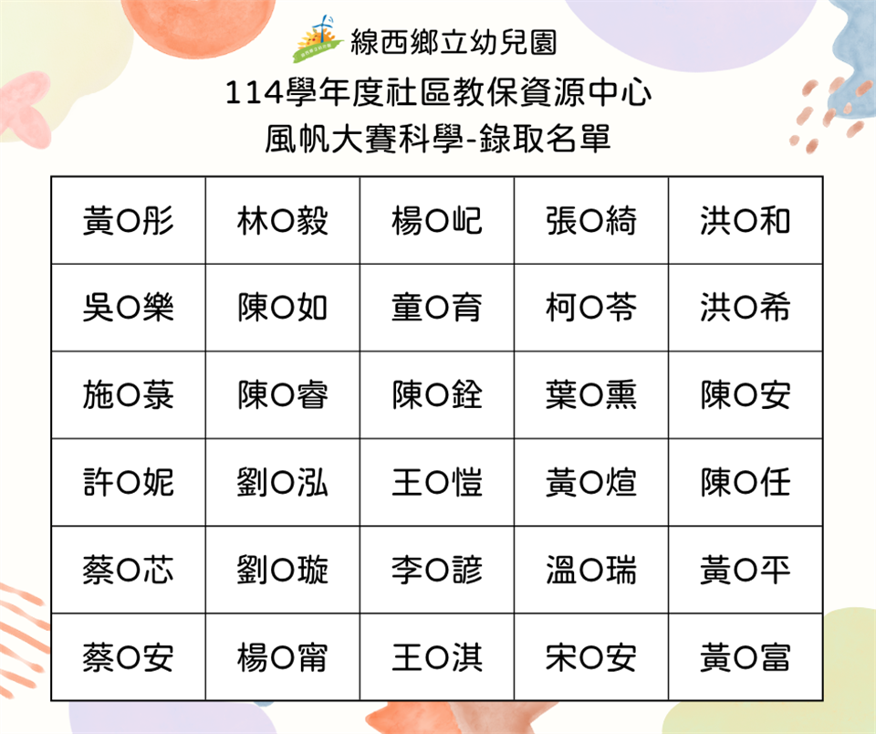 最新公告 114學年度社區教保資源中心-風帆大賽科學錄取名單 發布日期: 2025/10/17~2025/11/17 | 瀏覽人數: 7人 【114學年度 線西郷立幼兒園 社區教保資源中心】《風帆大賽科學》錄取名單活動時間:114年10月25日(六)上午9:00地點:線西鄉立幼兒園報到時間:8:50開始報到請家長們記得讓孩子吃完早餐再來,不需提早抵達喔”座位有限,每組親子僅提供2張座位(1位孩童+1位家長)