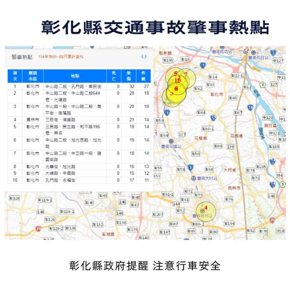 最新公告 本縣114年1-8月道路交通事故死傷累計20,913人。 發布日期: 2025/11/19 | 瀏覽人數: 34人 根據交通部道安資訊查詢網,本縣114年1-8月道路交通事故與112年同期比較分析,以少年自行車騎士(含電自、電輔) 事故增加39.5%最高,外籍人士事故增加34.3%次之,自小客車駕駛人增加24.7%再次之。1-8月份30日鄉鎮市每千人死傷人數於「彰化市、員林市、二林鎮」為多,肇事熱點以「彰化市」為多。 一、自行車兩車道以上請兩段式左轉,騎車不分心,平安每一程。二、Slow down and keep distance. Protect everyone on the road.三、轉彎不硬闖、路口多停讓,安全有保障!