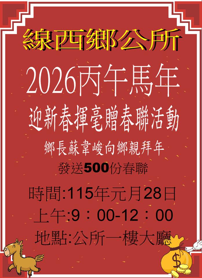 藝文資訊 線西鄉公所115年丙午馬年現場揮毫贈春聯活動 發布日期: 2026/01/12~2026/01/29 | 瀏覽人數: 85人 主 旨:為宏揚傳統國粹及藝術文化,豐富民眾精神生活,並提前讓民眾感染過年的氣氛。辦理單位:線西鄉公所(圖書館)活動日期:115年1月28日(星期三)上午9:00-12:00活動地點:線西鄉公所一樓大廳鄉長 蘇韋峻 發送500份春聯向鄉親賀年,歡迎鄉親踴躍索取,每人限索取一副,送完為止。
