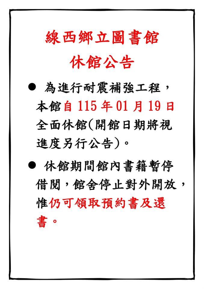 最新公告 線西鄉立圖書館 訂於115年1月19日(一)起休館,進行耐震補強工程。 發布日期: 2026/01/08 | 瀏覽人數: 16人 線西鄉立圖書館~休館公告為進行耐震補強工程,本館自115年01月19日全面休館(開館日期將視進度另行公告)。休館期間館內書籍暫停借閱,館舍停止對外開放,惟仍可領取預約書及還書。