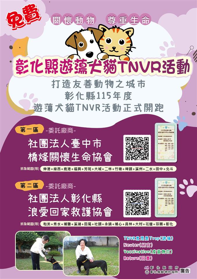 最新公告 彰化縣本(115)年度免費遊蕩犬貓TNVR活動開跑,歡迎民眾踴躍參加。 發布日期: 2026/01/31~2026/12/31 | 瀏覽人數: 30人 一、今年度委託彰化縣浪愛回家救護協會及臺中市橋烽關懷生命協會2家廠商,持續加強辦理免費遊蕩犬貓TNVR(即捕捉、絕育、注射狂犬病疫苗及回置)工作。二、歡迎有意協助本縣遊蕩犬貓絕育工作之縣民上網報名參加(官網報名網址如下:https://www.chcgadcc.gov.tw/?aid=503&page_name=detail&iid=85),報名時間即日起至10月31日止或經費用罄為止。