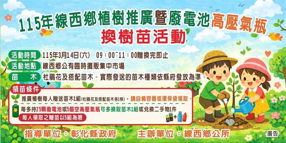 最新公告 115年線西鄉植樹推廣暨廢電池高壓氣瓶換樹苗活動 發布日期: 2026/03/02~2026/03/14 | 瀏覽人數: 96人 時間:115年3月14日上午09:00~11:00。贈換完即止地點:線西鄉公有臨時攤販集中市場旁苗木:杜鵑花及搭配苗木 (實際發送的苗木種類依縣府發放為準),請自備容器或環保袋領取。領苗條件:推廣植樹每人贈送苗木1組(每種各1株);另每多持25顆廢電池或5個空高壓氣瓶即可多換取苗木1組或兌換二手物1件。每人領取之贈換苗木以5組為限。