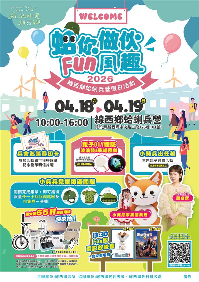 最新公告 115年度線西鄉蛤蜊兵營假日活動-「蛤你做伙 FUN風趣」 發布日期: 2026/03/24~2026/04/20 | 瀏覽人數: 118人 為藉由蛤蜊兵營保有原本建物原貌及文化價值,帶動觀光吸引更多人潮,本所將於4月18日(六)及4月19日(日)早上10點~下午4點,舉行115年度「蛤你做伙 FUN風趣」線西鄉蛤蜊兵營假日活動,現場將有市集、闖關活動、親子DIY、互動表演、電影放映、藝人演出等多項活動,讓您享受豐富趣味的假日,歡迎踴躍參加!