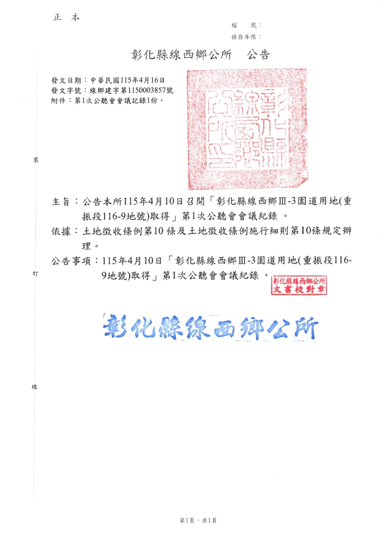 最新公告 公告本所115年4月10日召開「彰化縣線西鄉Ⅲ-3園道用地(重振段116-9地號) 取得」第1次公聽會會議記錄 發布日期: 2026/04/17~2026/04/30 | 瀏覽人數: 35人 115年4月10日召開「彰化縣線西鄉Ⅲ-3園道用地(重振段116-9地號)取得」第1次公聽會會議記錄。