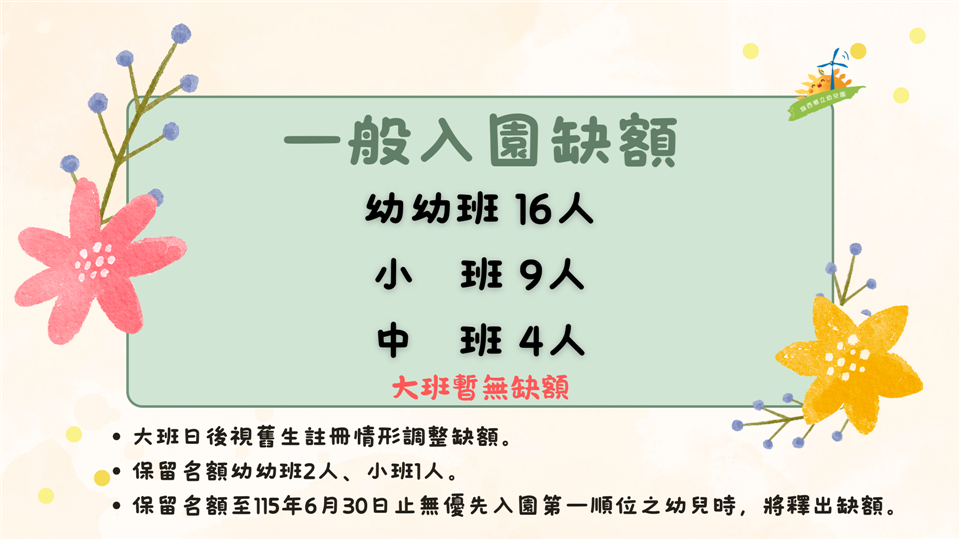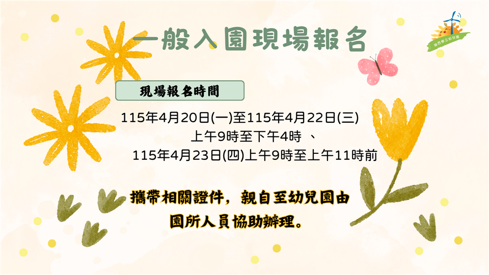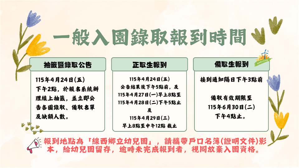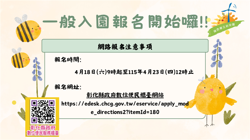 最新公告 📢線西鄉立幼兒園115學年度招生 發布日期: 2026/04/17 | 瀏覽人數: 28人 第二階段|一般入園報名📌缺額人數:幼幼班16人、小班9人、中班4人。📌報名時間:4月18日(星期六)9點起至4月23日(星期四)12點截止。📌報名方式:請家長至彰化縣政府數位便民櫃臺網站(https://edesk.chcg.gov.tw/eservice/apply_mode_directions2?itemId=180) 「線上」登記報名。📌 若網站操作有問題,請攜帶戶口名簿或3個月內有效之戶籍謄本正本,於4/20(一)~4/22(三)上午9點~下午4點,及4/23(四)上午9點~11點前,至線西鄉立幼兒園由人員協助您辦理。📌注意事項:每位幼兒於各階段登記園數以「1園」為限,若重複登記報到,視為放棄所有登記及錄取之資格。☎️洽詢專線:04-7584851💖誠摯歡迎您的寶貝加入我們的大家庭💖歡迎預約參觀,親自感受環境💖讓孩子在愛與關懷中快樂成長💖給寶貝一個安心學習的起點!提醒您:請持續關注最新公告,以免錯過報名時間