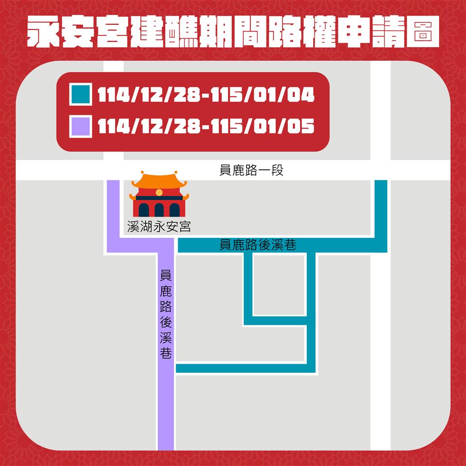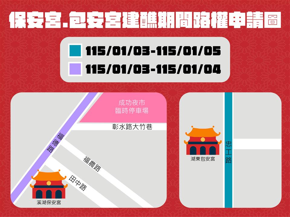 最新公告 建醮活動道路資訊公告 發布日期: 2025/12/29~2026/01/04 | 瀏覽人數: 873人 | 聯絡資訊: 建設課 8852121 【建醮活動道路資訊公告】 因本鎮於年底舉辦大型建醮活動,各廟方將依其申請路權規模與內容,自行辦理道路使用及交通管理,本所僅協助彙整相關封路範圍及時間資訊。 有關大家關心的市區道路通行問題,目前僅有下列路段(詳如附圖)封閉,提供鎮民朋友參考並請及早改道。 【停車資訊說明】為因應建醮活動期間預期吸引大量人潮,本所已協助規劃並提供數處臨時停車場供民眾使用,請來訪民眾多加利用,並依現場指示停放車輛,以維持周邊道路順暢 (停車場位置詳如附圖) 提醒各位鄉親:道路封閉及現場交通引導將由各主辦廟方負責,請用路人配合現場工作人員指揮通行。為避免耽誤行程,建議提早規劃替代路線或避開壅塞路段。 各宮廟申請使用之道路路段,將於115年1月4日建醮活動結束後,陸續撤除相關管制設施並恢復通行,造成不便,敬請見諒,感謝大家的配合