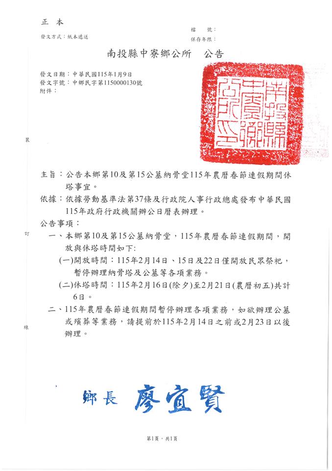 檢送南投縣中寮鄉公所第10及第15公墓納骨塔115年度農曆春節連假休塔時間公告1份