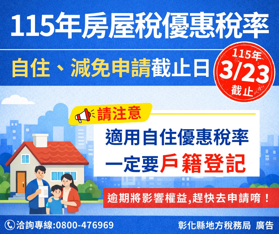 最新公告 檢送「房屋稅享優惠趁現在」宣導電子檔1份 發布日期: 2026/03/10~2026/04/10 | 瀏覽人數: 22人 1、如欲享房屋稅自住優惠,請於115年3月23日前辦竣戶籍登記並提出申請,當期就能適用。2、115年房屋稅符合自住、減免條件者,請於115年3月23日前提出申請,守護權益輕鬆省。