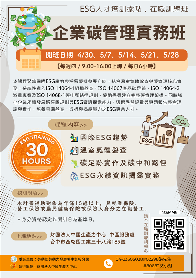最新公告 檢送財團法人中國生產力中心承辦勞動部勞動力發展署中彰投分署「114-116年度產業人才培訓據點計畫-企業碳管理實務班(在職班)」EDM 發布日期: 2026/04/10~2026/05/10 | 瀏覽人數: 7人 課程資訊如下:(一)報名對象:投保勞保之在職勞工,性別不拘,不限科系,專科(含)以上學歷。(二)報名期間:即日起至115年4月22日(星期三)17:00止。(三)甄試日期:115年4月24日(星期五)早上9:00開始(書審)。(四)訓練期間:115年4月30日至115年5月28日(每週四,早上9:00至下午4:00),共計30小時。(五)報名方式: 請上台灣就業通網站(https://ojt.wda.gov.tw/ClassSearch/Detail?OCID=171131&plantype=5)報名,或洽本中心負責窗口洪先生:(04)2350-5038分機02298。