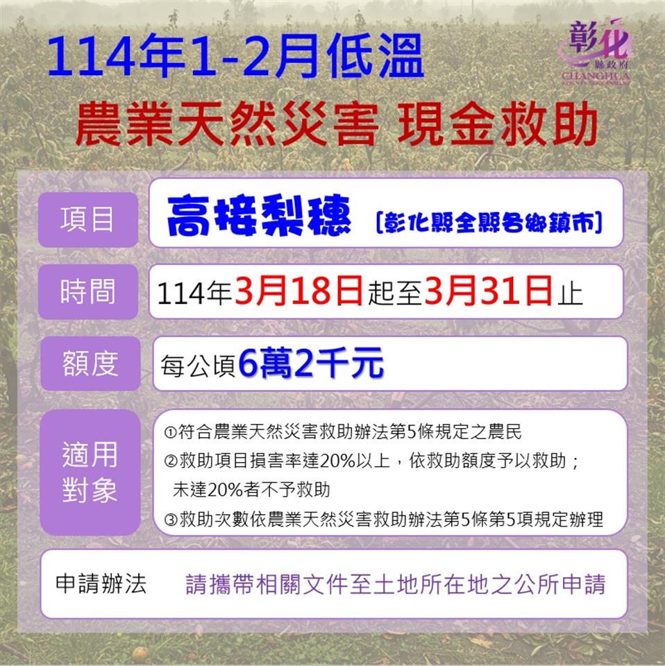 最新公告 114年1-2月低溫高接梨穗農業天然災害現金救助 歷史訊息 | 發布日期: 2025/03/19~2025/03/31 | 瀏覽人數: 174人 | 聯絡資訊: 賴小姐 048221191分機232 114年1-2月低溫造成彰化縣高接梨穗損害案,農業部業於114年3月18日公告彰化縣為辦理高接梨穗農業天然災害現金救助地區,若有符合申請條件之農民,請依期限至本所農業課辦理。