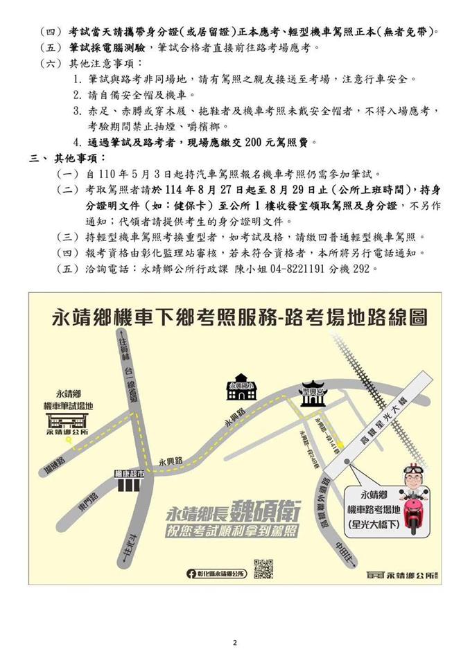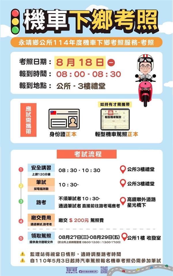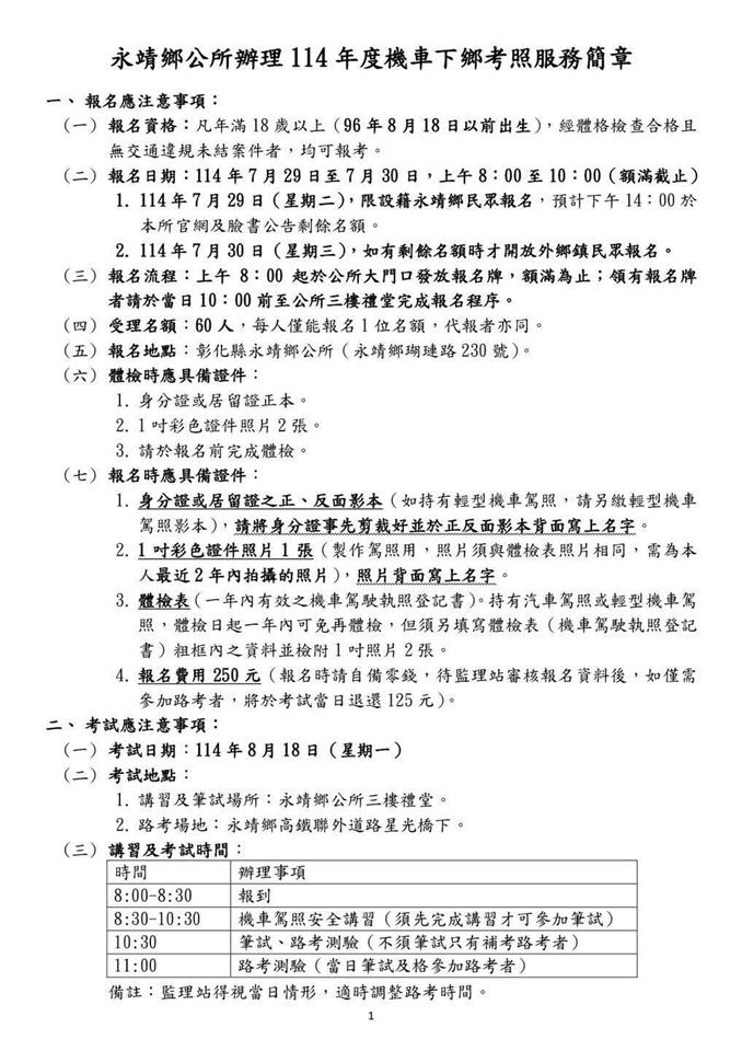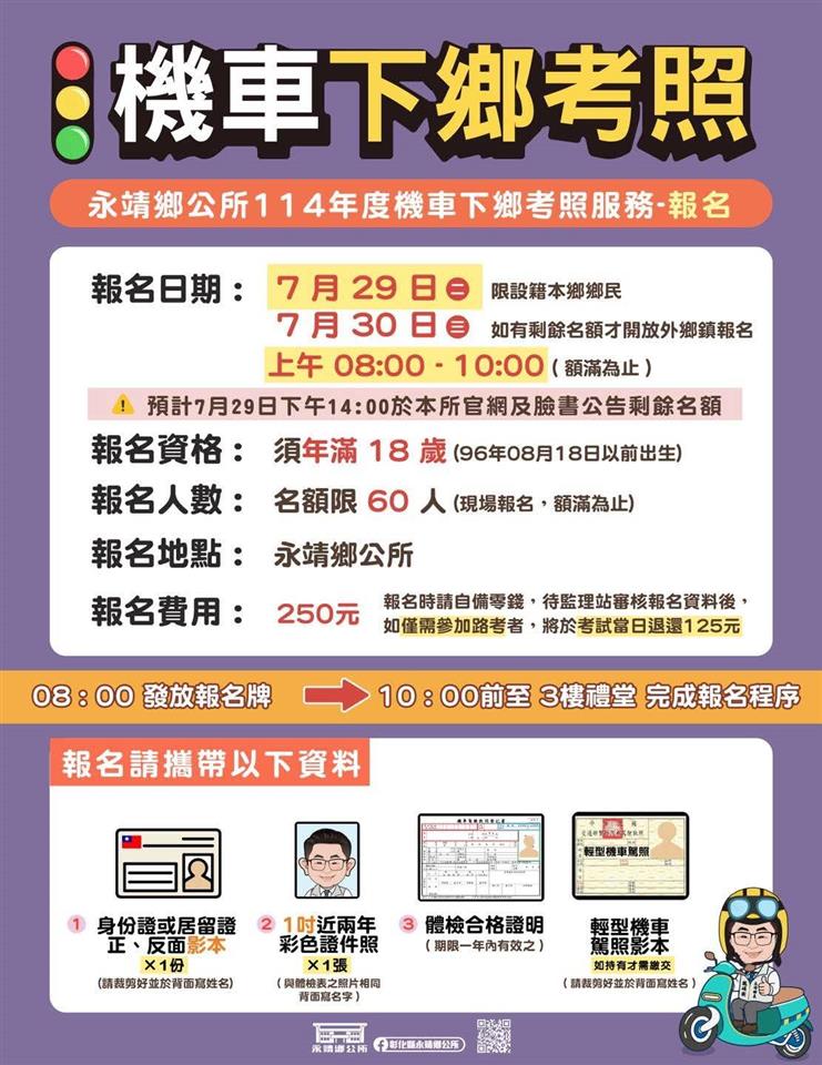 最新公告 【公告】永靖鄉公所辦理114年機車下鄉考照服務 歷史訊息 | 發布日期: 2025/07/04~2025/08/29 | 瀏覽人數: 946人 | 聯絡資訊: 陳小姐 048221191分機292 🎉114年永靖鄉機車下鄉考照來囉🛵🛵‼記得‼先做體檢➡7月29-30日報名➡8月18日考試➡8月27-29日領駕照請參閱「永靖鄉公所辦理114年度機車下鄉考照服務簡章」 1.【體檢】✔身分證或居留證正本。✔一吋彩色證件照片2張。 2.【報名】📌報名日期:7/29(二)「限設籍永靖鄉民眾」,上午8:00至10:00(額滿提前截止)📌報名流程:上午8:00起於公所大門口發放報名牌,領有報名牌者請於當日10:00前至公所三樓禮堂完成報名程序。 🔥「如有剩餘名額」7/30開放外鄉鎮民眾報名。7/29(二)下午14:00前於本所官網及臉書公告剩餘名額。報名流程、時間同7/29。📌受理名額:60名,每人僅能報名1位名額,代報者亦同。📌報名費用:報名費250元(報名時請自備零錢,待監理站審核報名資料後,如僅需參加路考者,將於考試當日退還125元)📌應備文件及注意事項:✔身份證或居留證正、反面影本1份(請裁剪好並於背面寫姓名)。✔一吋彩色證件照1張(與體檢表照片同一張,且為最近2年內拍攝的照片,背面寫姓名)。✔體檢表(一年內有效之機車駕駛執照登記書)。✔如持有輕型機車駕照者,請另繳交駕照影本(請裁剪好並於背面寫姓名)。 3.【考試】📌考照日期:8月18日(一)📌考照地點:✳講習➡公所三樓禮堂✳筆試➡公所三樓禮堂✳路考➡永靖鄉高鐵聯外道路星光橋下📌考試流程:▶8:00~8:30 完成報到▶8:30~10:30 機車駕照安全講習▶10:30~ 筆試、路考測驗(不須筆試只有補考路考者)▶11:00~ 路考測驗(當日筆試及格參加路考者)📌應備文件及注意事項:✔請攜帶身分證或居留證正本、輕型機車駕照正本(無者免帶)應考。✔筆試採電腦測驗,筆試及格者直接至路考場地應考。✔只補考路考者,10:30前直接到路考場地。✔通過路考者,現場繳交200元駕照製作費及身分證正本。 4.【領駕照】📌領照日期:8月27日(三)起至8月29日(五)止,8:00-12:00、13:00-17:00📌領照地點:永靖鄉公所1樓收發室📌證明文件:持身分證明文件(如:健保卡)領取;代領者請提供考生本人的身分證明文件。 ☎洽詢專線:04-8221191分機292 永靖鄉公所行政課 陳小姐