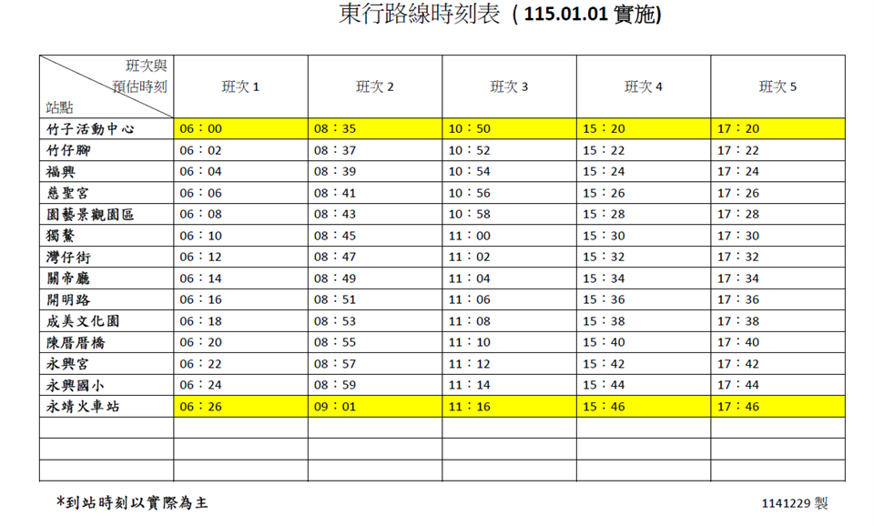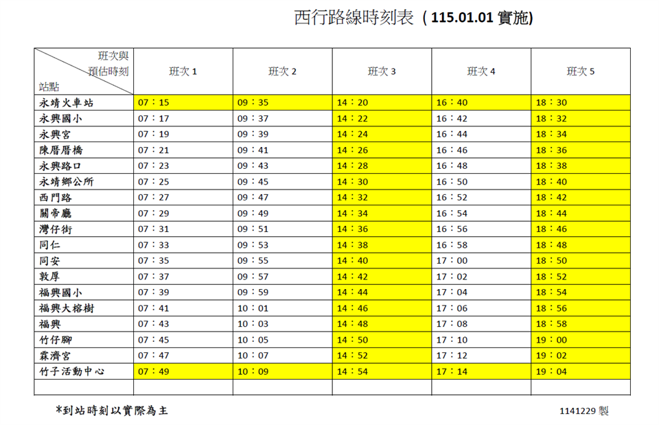 最新公告 【公告】永靖鄉幸福巴士時刻表公告更新版 發布日期: 2025/12/30~2027/12/31 | 瀏覽人數: 247人 | 聯絡資訊: 黃小姐 8221191分機228 永靖鄉公所幸福巴士,週一至週五均有行駛(例假日停駛)。行駛路線:(路線及班次由公所視營運狀況調整,增減站數及班次)★西行航線:永靖火車站→竹子活動中心★東行航線:竹子活動中心→永靖火車站巴士時刻表配合火車時刻,班次於115年01月01日更新(本次更新班次已註記)歡迎大家多多搭乘利用~~永靖鄉幸福巴士網址更新時刻表公告如附件!