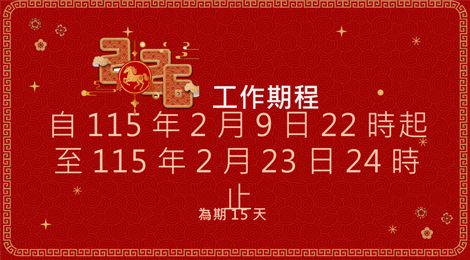 最新公告 「115年加強重要節日安全維護工作期程、工作主軸-治安平穩、交通順暢、民眾安心」 發布日期: 2026/02/03~2026/02/28 | 瀏覽人數: 8人 | 聯絡資訊: 張先生 8221813