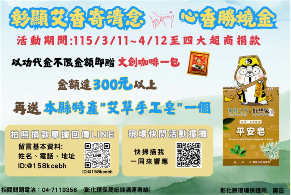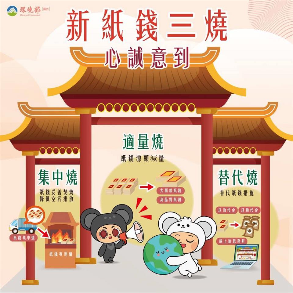 最新公告 清明節「紙錢集中燒」措施宣導 發布日期: 2026/03/23~2026/04/05 | 瀏覽人數: 34人 | 聯絡資訊: 8221191分機 清明節期間民眾掃墓祭祖活動頻繁,紙錢焚燒量大幅增加,易造成空氣污染並引發火災致影響環境品質及危害公共安全。請配合環境部推動「新紙錢三燒政策」,包括「集中燒」、「適量燒」及「替代燒」,在兼顧民俗文化與環境保護下,請民眾響應紙錢減燒措施,鼓勵以「紙錢減量」、「以功代金」、「以米代金」及「環保祭祀」等方式祭祖,逐步減少紙錢焚燒量。