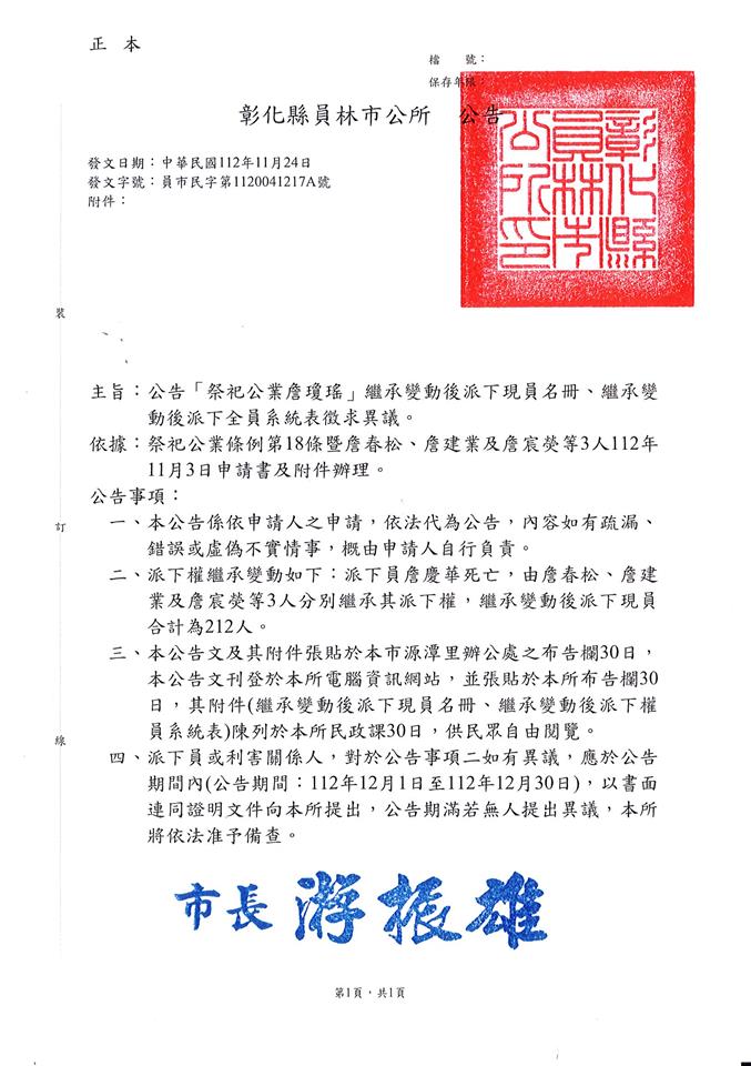 最新公告 公告「祭祀公業詹瓊瑤」繼承變動後派下現員名冊、繼承變動後派下全員系統表徵求異議 歷史訊息 | 發布日期: 2023/11/28~2023/12/31 | 瀏覽人數: 60人 | 聯絡資訊: 民政課林小姐 04-8347171#501 公告事項:一、本公告係依申請人之申請,依法代為公告,內容如有疏漏、錯誤或虛偽不實情事,概由申請人自行負責。二、派下權繼承變動如下:派下員詹慶華死亡,由詹春松、詹建業及詹宸熒等3人分別繼承其派下權,繼承變動後派下現員合計為212人。三、本公告文及其附件張貼於本市源潭里辦公處之布告欄30日,本公告文刊登於本所電腦資訊網站,並張貼於本所布告欄30日,其附件(繼承變動後派下現員名冊、繼承變動後派下權員系統表)陳列於本所民政課30日,供民眾自由閱覽。四、派下員或利害關係人,對於公告事項二如有異議,應於公告期間內(公告期間:112年12月1日至112年12月30日),以書面連同證明文件向本所提出,公告期滿若無人提出異議,本所將依法准予備查。