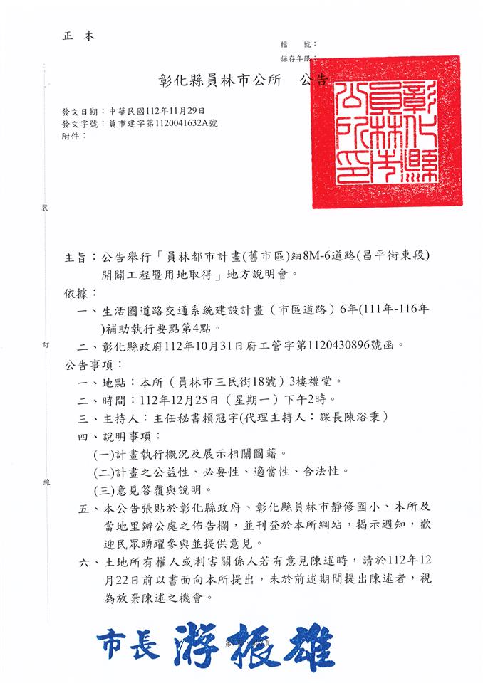 最新公告 公告舉行「員林都市計畫(舊市區)細8M-6道路(昌平街東段)開闢工程暨用地取得」地方說明會 歷史訊息 | 發布日期: 2023/11/29~2023/12/29 | 瀏覽人數: 53人 | 聯絡資訊: 建設課魏先生 04-8347171#516 詳請請參閱附圖~