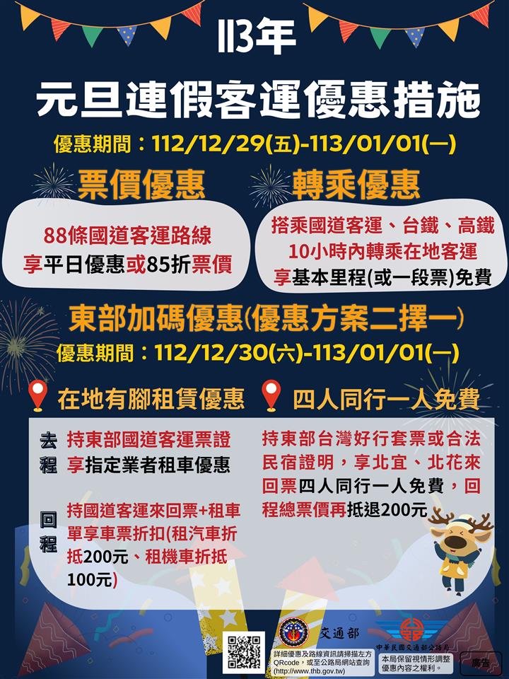 最新公告 【轉知】113年元旦連續假期公共運輸優惠措施案 歷史訊息 | 發布日期: 2023/12/13~2024/01/13 | 瀏覽人數: 33人 | 聯絡資訊: 建設課陳先生 04-8347171#105 詳情請參閱附圖~