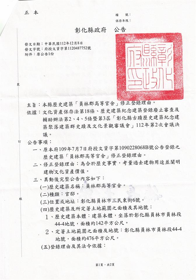 藝文資訊 公告本縣歷史建築「員林郡高等官舍」修正登陸理由 歷史訊息 | 發布日期: 2023/12/16~2024/01/16 | 瀏覽人數: 40人 | 聯絡資訊: 觀光發展課陳小姐 04-8347171#174 詳情請參閱附件~