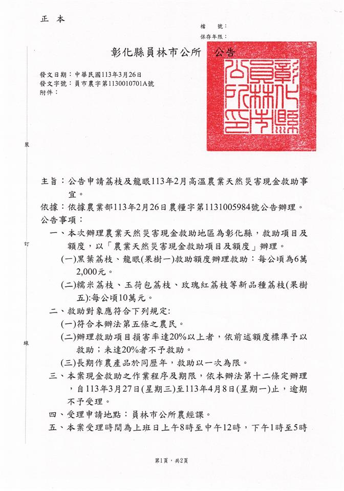 最新公告 荔枝及龍眼113年2月高溫農業天然災害現金求助公告 歷史訊息 | 發布日期: 2024/03/26~2024/04/30 | 瀏覽人數: 33人 | 聯絡資訊: 農經課林小姐 04-8347171#156 詳情請參閱附圖~