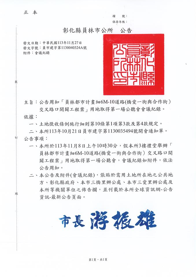 最新公告 【公告】員林市橋愛一街與合作街交叉路口開闢工程-第1場公聽會紀錄 歷史訊息 | 發布日期: 2024/11/27~2025/02/27 | 瀏覽人數: 68人 | 聯絡資訊: 建設課魏先生 04-8347171#516 詳情請參閱附件