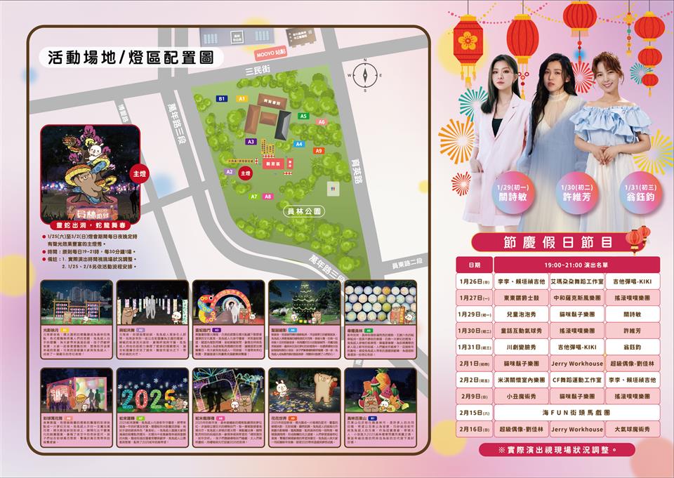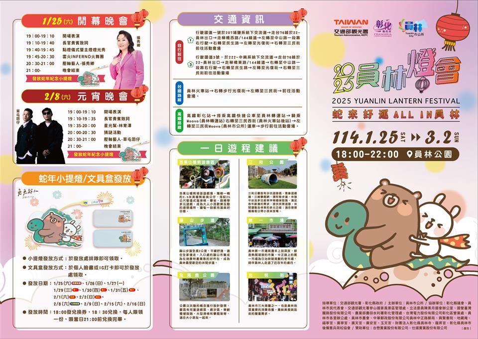 最新公告 🧨「2025蛇來好運 All in 員林」員林燈會暨元宵節活動 歷史訊息 | 發布日期: 2025/01/21~2025/03/02 | 瀏覽人數: 1457人 | 聯絡資訊: 觀光發展課吳先生 04-8347171#177 詳請請參閱活動DM~