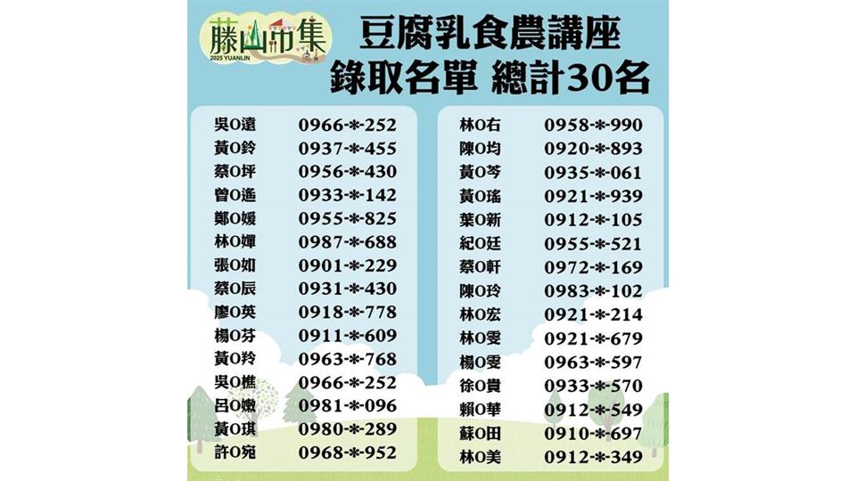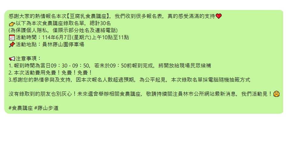 最新公告 📢114年6月7日(星期六)【醇香發酵豆腐乳】食農講座錄取名單 歷史訊息 | 發布日期: 2025/06/04~2025/06/08 | 瀏覽人數: 69人 | 聯絡資訊: 農經課詹小姐 04-8347171#153 詳情請參閱附圖~